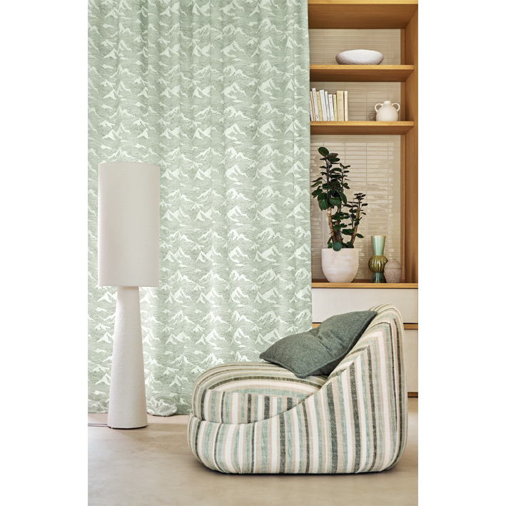 “PIEMONTE” suggests a mountain landscape on a linen-look fabric. The panorama is subtly expressed using delicately embroidered stitches. The cotton and linen embroidery thread has a two-tone look that accentuates the natural style of the fabric and the softness of the décor.