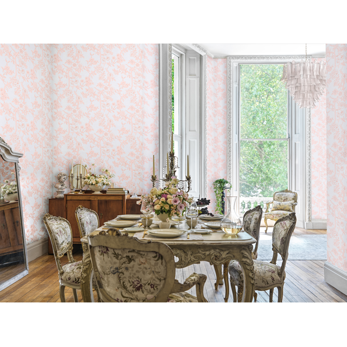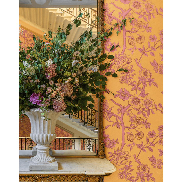 Paradise Tree's sprawling boughs create a rich and lush canopy of flora and foliage. The design is offered in soft pastels of Dove Grey, Pastel Blue and Soft Pink, Buttercup Yellow and Cream, and Cornflower Blue and Soft White, as well as the mood-boosting, vibrant brights of Tangerine and Hibiscus and Emerald and Petal Pink providing a variety of interior options with the Emerald ground colour harking back to 19th century greens that remained ever-popular in High Society homes.