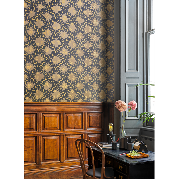 Moss Trellis' large-scale design was designed in 1935, belying its 1930s roots with its bold, abstract print. Presented in the demure, rosy pinks of Soft Coral and Shell Pink, and Steel and Rose, the contemporary earthy, forest greens of Evergreen and Antique Gold, and Matcha and Pistachio bring the design firmly into the 21st century. With the addition of metallic detailing, the show-stopping Black and Gold brings an opulence to this classic design.