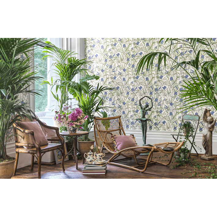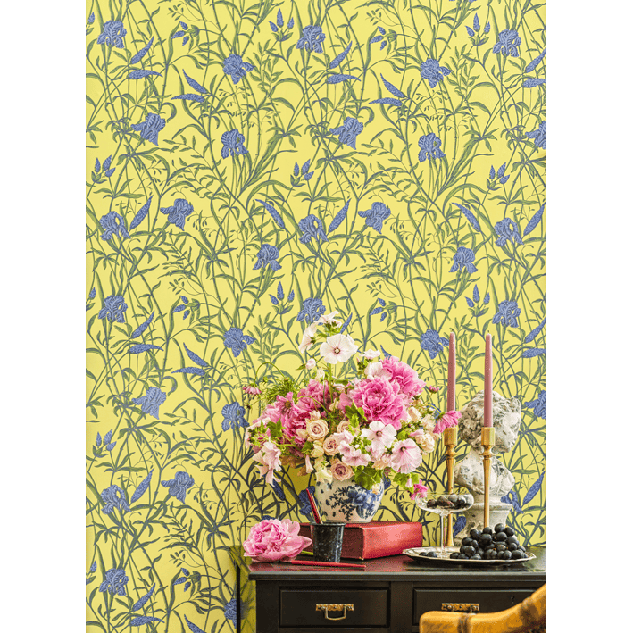 The leafy, detailed linework of Iris is typical of its once screen-printed production, with each layer being perfectly imperfect in its overlapping. The flower’s unique shape and immersive leaf repeat creates a full and lush wallcovering.