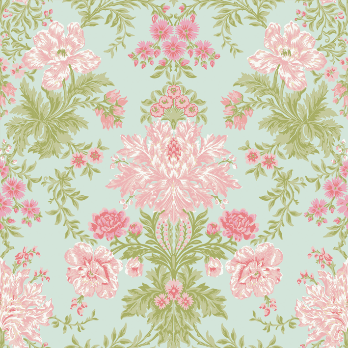 Blousy and charming, Poppies’ vintage print of blooming florals and ruffled dissected leaves creates a regal damask. Retaining many of its original archive design aspects, Poppies’ Soft Yellow, Cream and Spring Green on Terracotta has a rich depth and warmth, whilst palettes of Soft Fuchsia, Buttercup and Fern on Cream; Soft Pink, Blush and Soft Green on Mint; Sapphire, Cerulean and Moss on Stone; and Peach, Marigold and Grass on Soft Green create a jubilant interior.