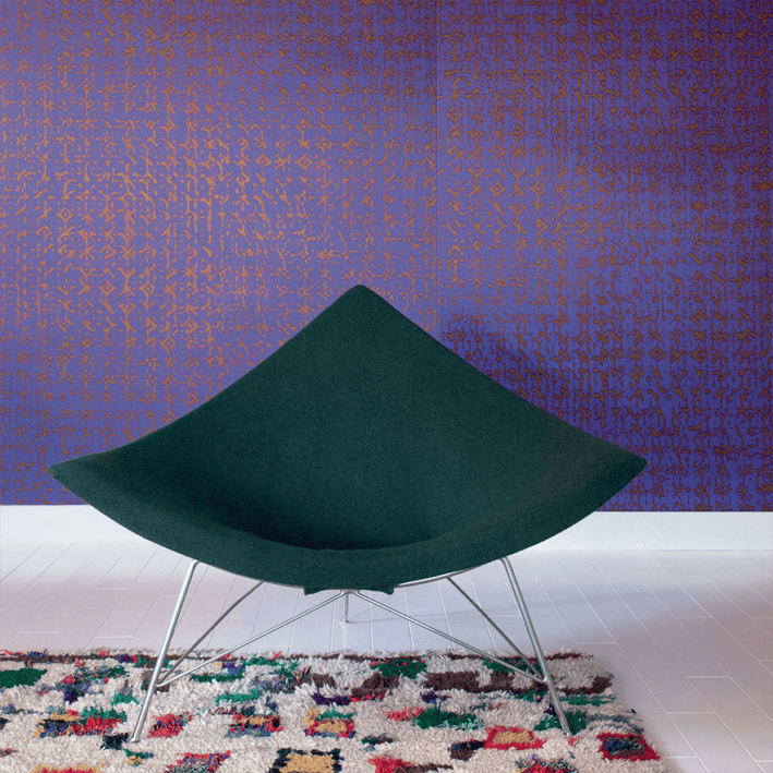 End-on-end bonded and tightened on non-woven backing, the tone is set for a collection inspired by fabric printing, designs inspired by Moroccan dyes, Indonesian batik sarongs. In a pictorial motif theme incorporating fused inks and watercolour drawings.