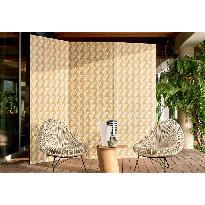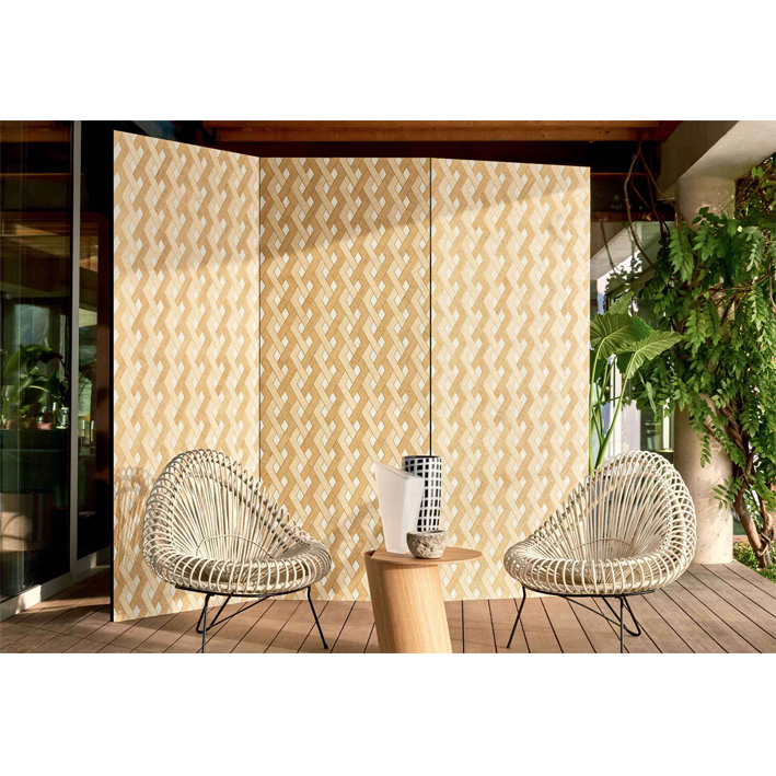 This 100% natural fibre collection shows raffia in a new light. In contrast to its more “raw” signature incarnations, it expresses a very contemporary universe where the inspirations of painters and great architects mingle through a resolutely graphic approach: geometric layouts. Motivated by the layout work found in Essence de Bois, we composed these real puzzles piece by piece, positioning and repositioning the cut-outs at will to create dense, graphic and rich imaginary universes. The workshop to which we have entrusted the manufacturing performs incredible workmanship on each creation, by hand, element by element.