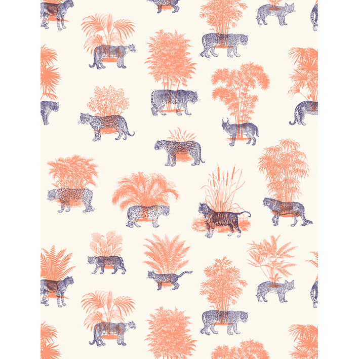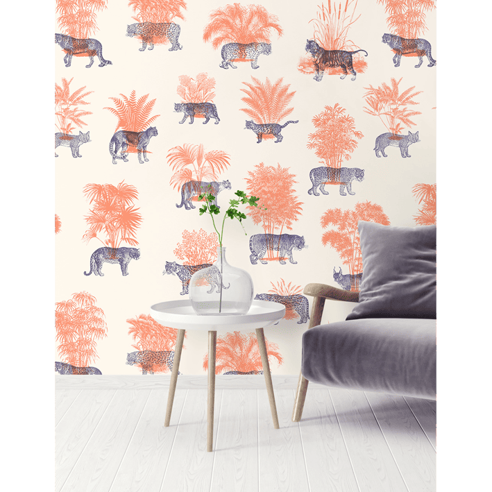 Created by established French artist Florent Bodart, Where They Belong Tropical Duo features a mixture of bold peach and blue colours that meld to create a tropical jungle motif. This vintage cream & red leopard and tiger wallpaper has a vintage style and uses modern techniques to create a luxurious feel in the home.