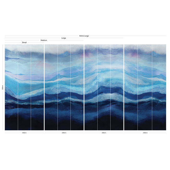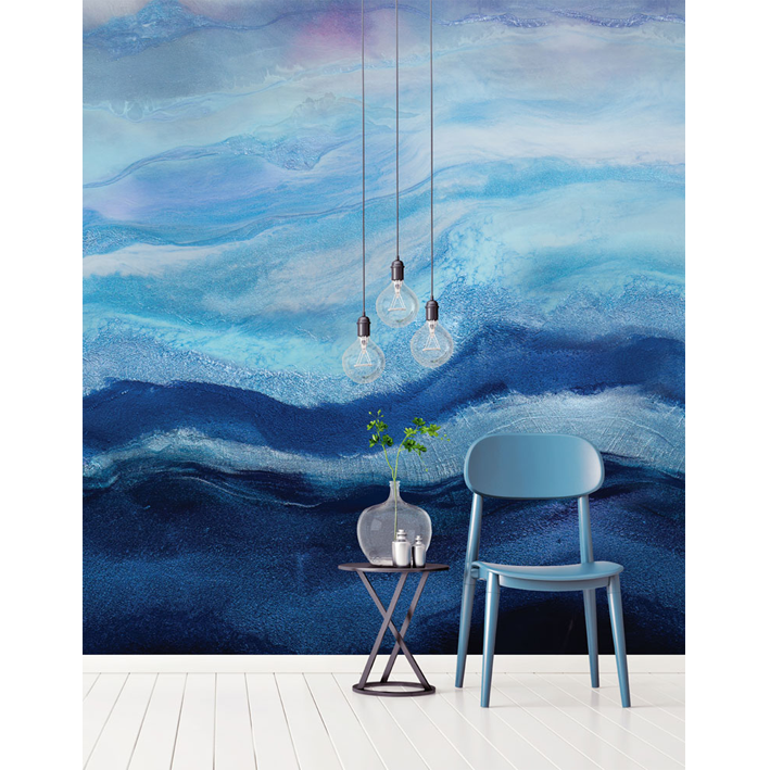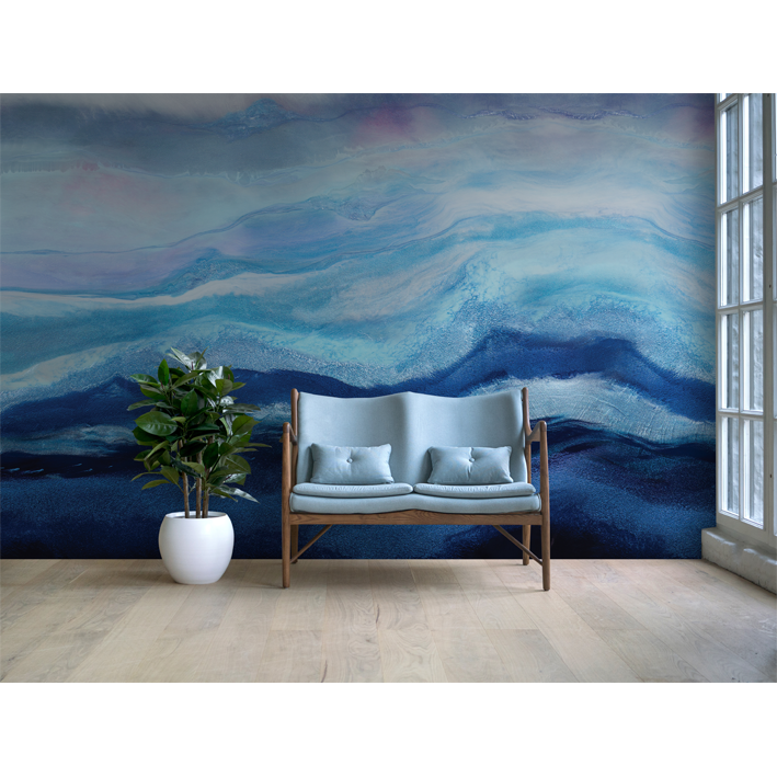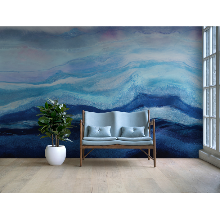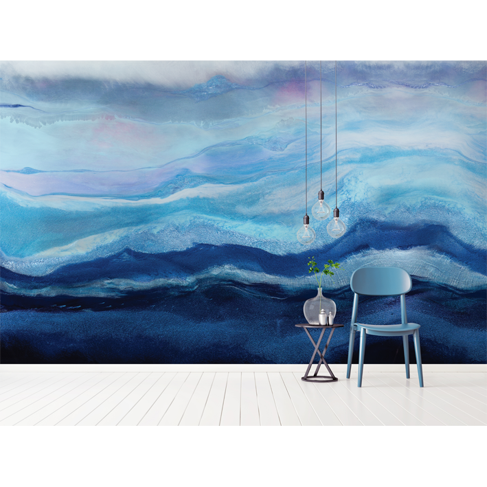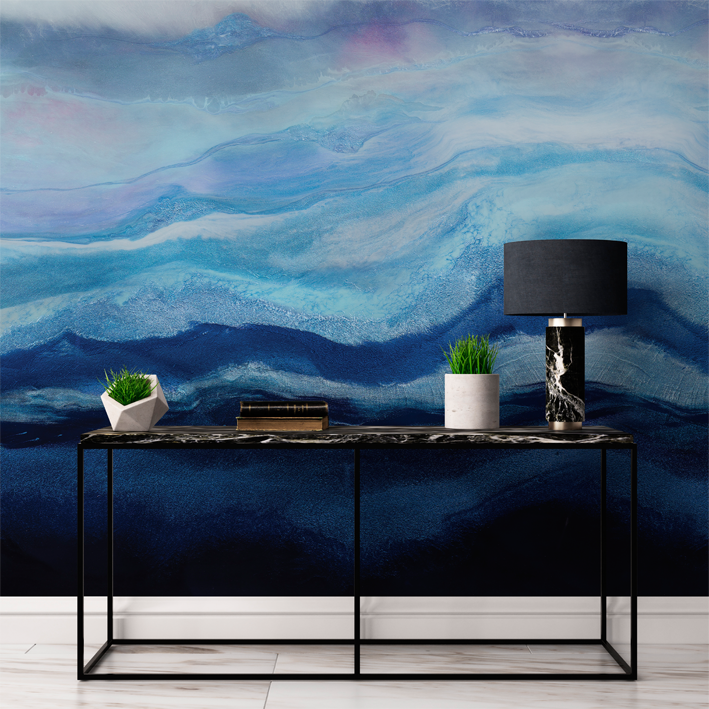 This richly pigmented seascape wallpaper mural is layered with hues of indigo and aquamarine pigments. Depth and movement were created to draw the viewer into the waves. A layer of arctic mist hovers above the water creating a sense of chill in the air. A cool toned color palette was used to create this modern resin painting.