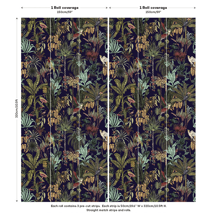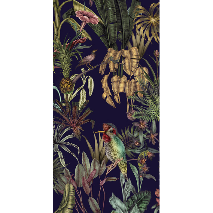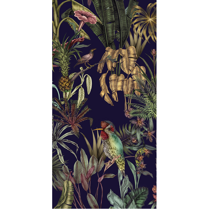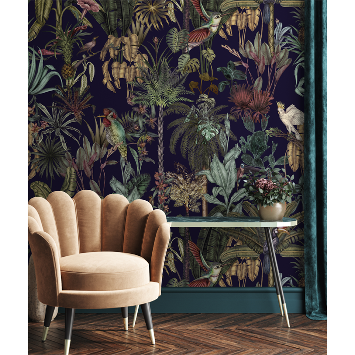 Our Birds Birds exotic bird wallpaper is the perfect blue bird wallpaper for anyone who wants to bring a touch of the tropics into their home. Originally hand-drawn, this tropical birds adorn this wallpaper amongst stunning flowers and all set against a dark blue wallpaper background. This tropical-themed wallpaper is perfect for a maximalist interior design scheme as it’s full of rich colours and details. Whether you’re looking to add some life with a new living room wallpaper or spice up your sleeping space with a jungle bedroom wallpaper, the Birds Birds wallpaper is sure to make a statement.