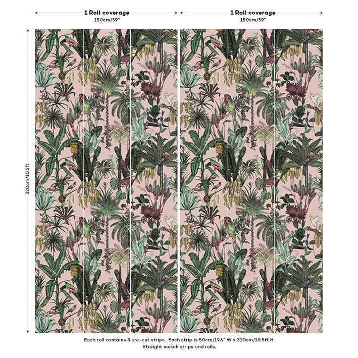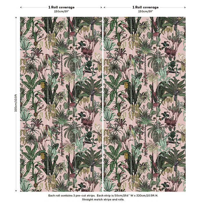 Birds Birds is a tropical pink bird wallpaper that takes its inspiration from the natural world. Featuring a collection of exotic tropical birds set amongst a lush jungle setting, this bird wallpaper brings the jungle into your home! Each illustration was originally hand-drawn, whilst the dusky pink wallpaper background adds some extra personality to your walls. Whether you’re looking for a maximalist wallpaper to make a statement or something more eclectic and floral, Birds Birds is the perfect wallpaper for you.
