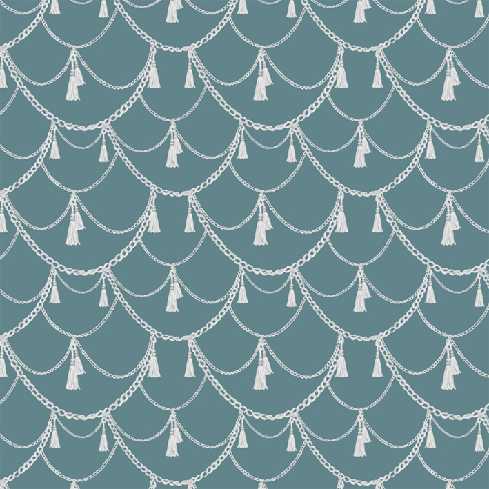 This teal & silver romantic pattern wallpaper mural offers elegance and romance through inspiration of a private lady’s dressing room from the Victorian era. The Boudoir wallpaper features detailed chains, tassels, and ropes in metallic hues that complement the background for a bedroom or powder room.