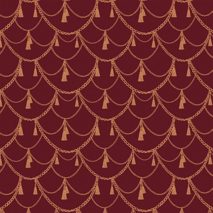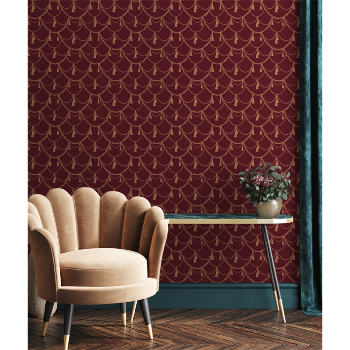 Combining the elegance of a Victorian dressing room with vibrant colours of the modern world, the Boudoir wallpaper takes vintage into the present. This red & bronze romantic pattern wallpaper mural features a vibrant background adorned with hanging chains, ropes, and tassels.