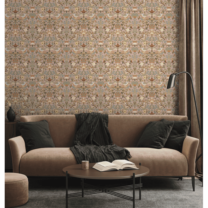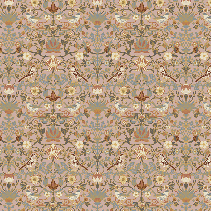 A vibrant background holds the beauty of flowers and other foliage with trees resting on branches in the Casterbridge wall mural. This pink & gold pattern wallpaper mural draws inspiration from the Arts and Crafts movement while incorporating metallic touches to stand out in the modern world.