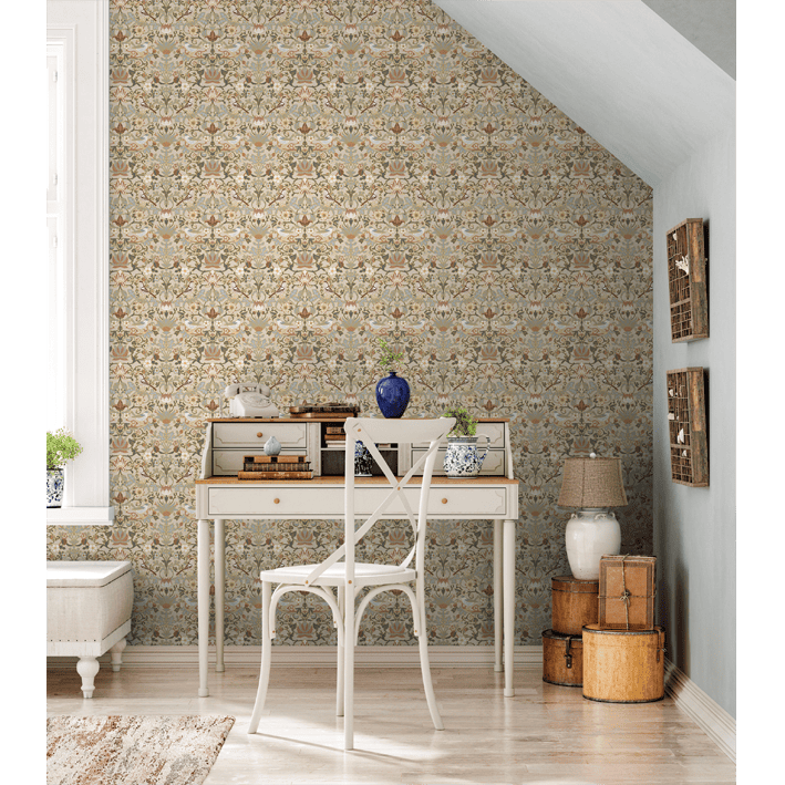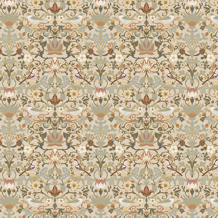 The Casterbridge wall mural takes a design from the Arts and Crafts movement and adds modern appeal through a touch of metallic elegance. This cream & gold floral pattern wallpaper mural features a rich pattern of floral blooms where stunning birds perch and rest.