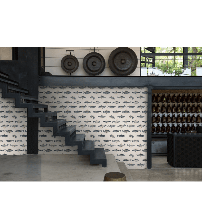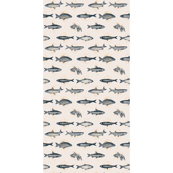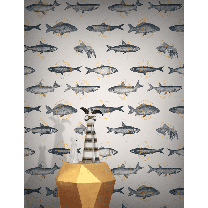 The Fishes in Geometrics wallpaper in pale & orange was created by Florent Bodart and brings together two distinct style for a modern home. This cream & orange trendy vintage fish wallpaper is striking and features lifelike fish that are trapped in various geometric shapes.