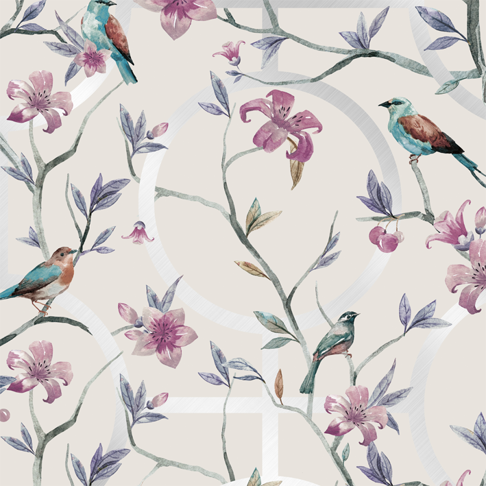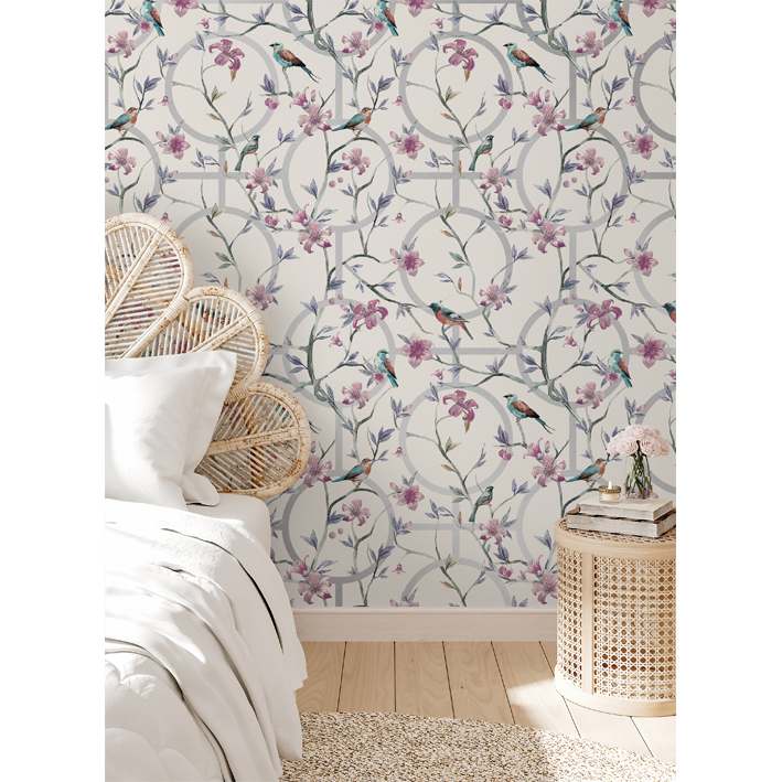 This cream & silver luxury floral geometric wallpaper will spice up your dining room. Engage in your love for birds and flowers by adding this wallpaper to any rooms in the house that could use some extra brightness and light. Small birds sit on branches near geometric shapes overlapped by flowers. Try it as kitchen wallpaper to elevate your surroundings.