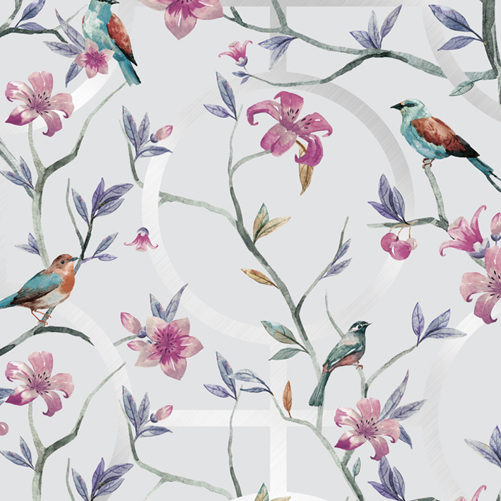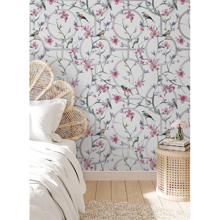 Created with light and beautiful colours, this grey & silver luxury floral geometric wallpaper has an understated beauty for use in a modern home. It can be used as kitchen, dining room, or bedroom wallpaper to add extra colour to the space. The wallpaper pictures several birds amongst the blooms and leaves of flowers with a white backdrop and several geometric objects.
