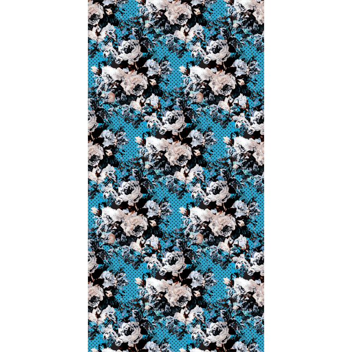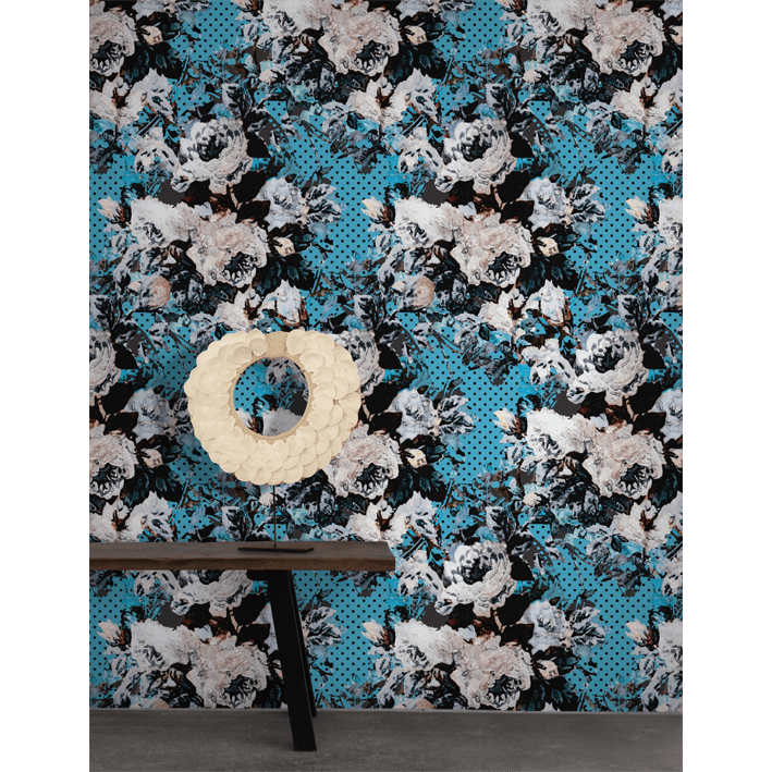 Made with a mixture of pop art designs and hand painted roses, Full Bloom wallpaper takes traditional florals and updates them for today’s world. This blue contemporary floral design wallpaper features modern colours juxtaposed against vintage patterns found in a renovation.