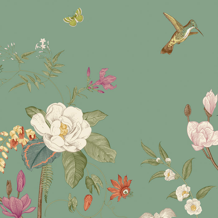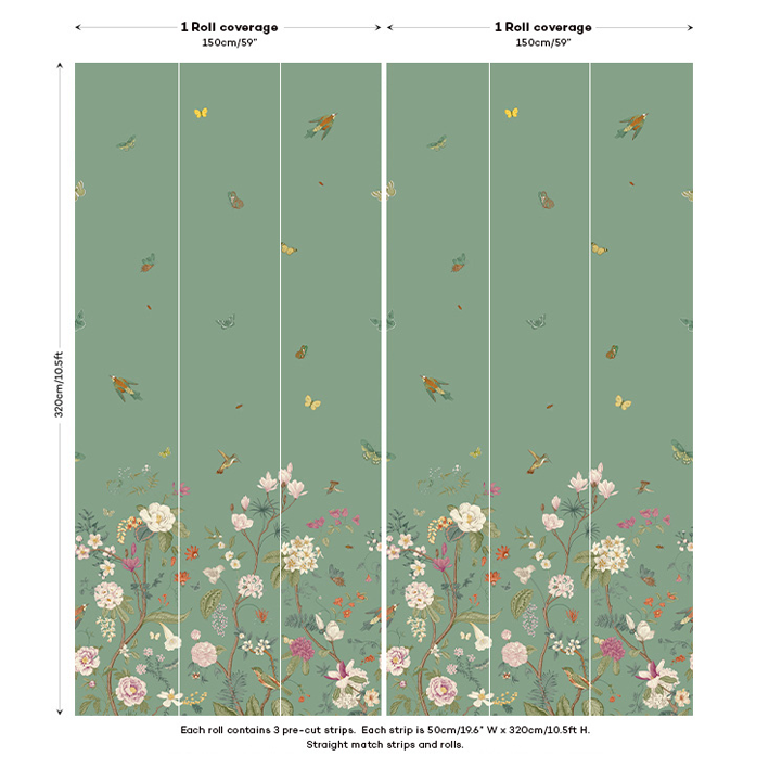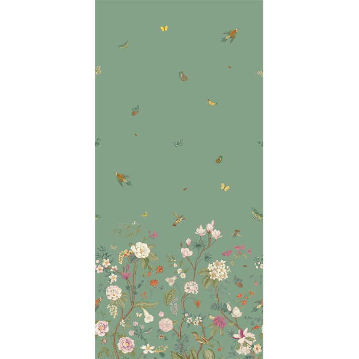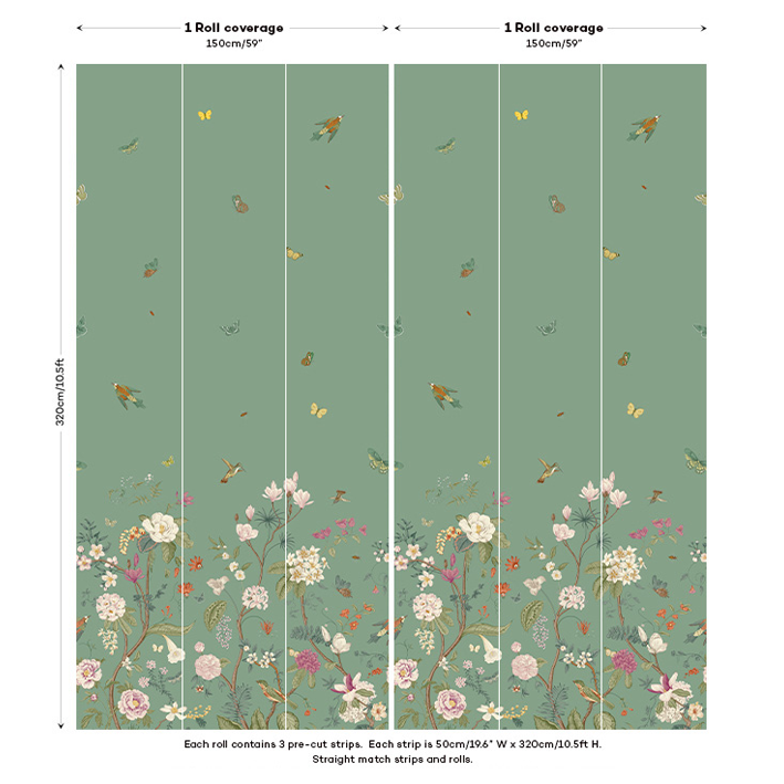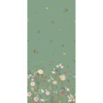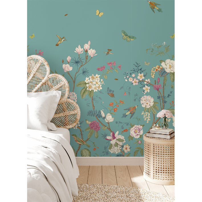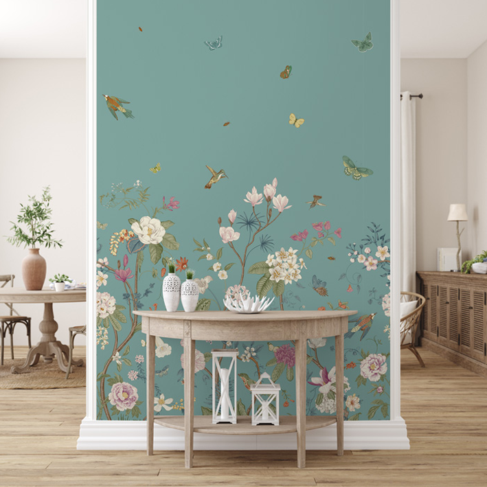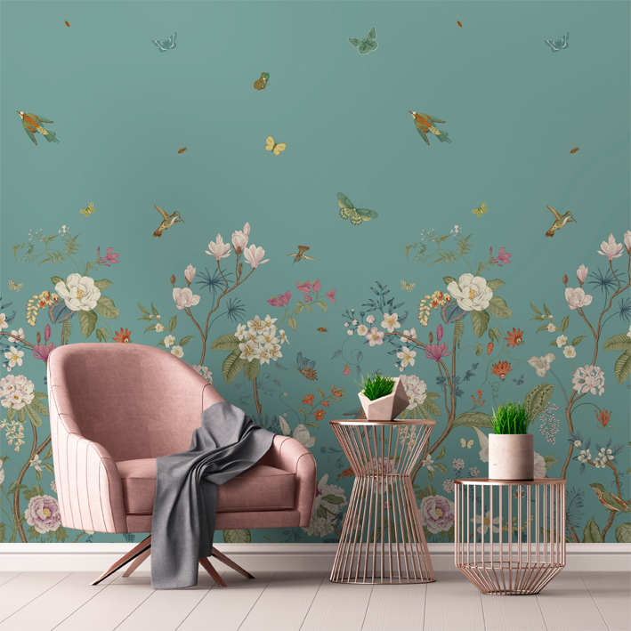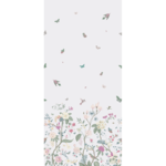 Whimsical and endearing, this teal butterfly floral wallpaper is the perfect way to brighten up a room. It has gorgeous artistry with flowers and butterflies mixing in a nature scene at the bottom of the wallpaper. As your eyes move up, this children’s bedroom wallpaper focuses on small animals flying through the air and creating a feeling of joy and hopefulness.