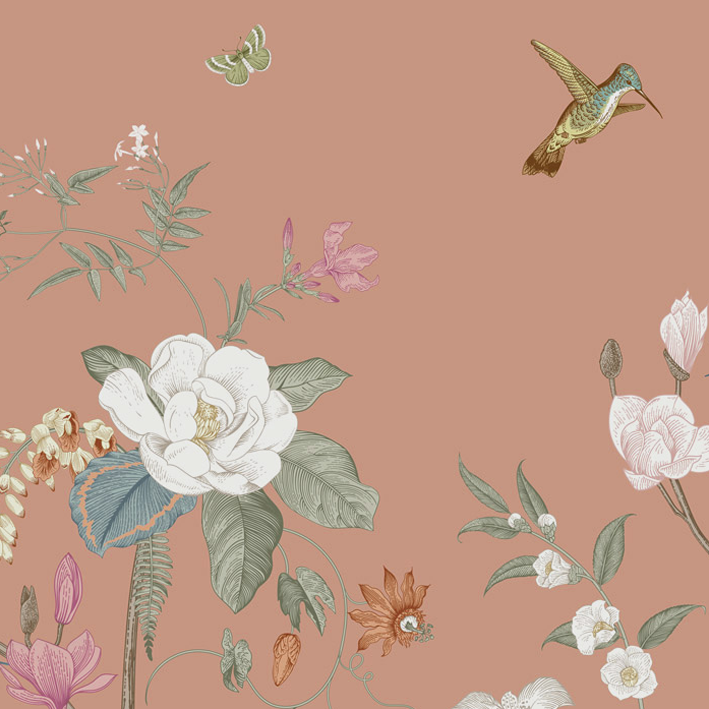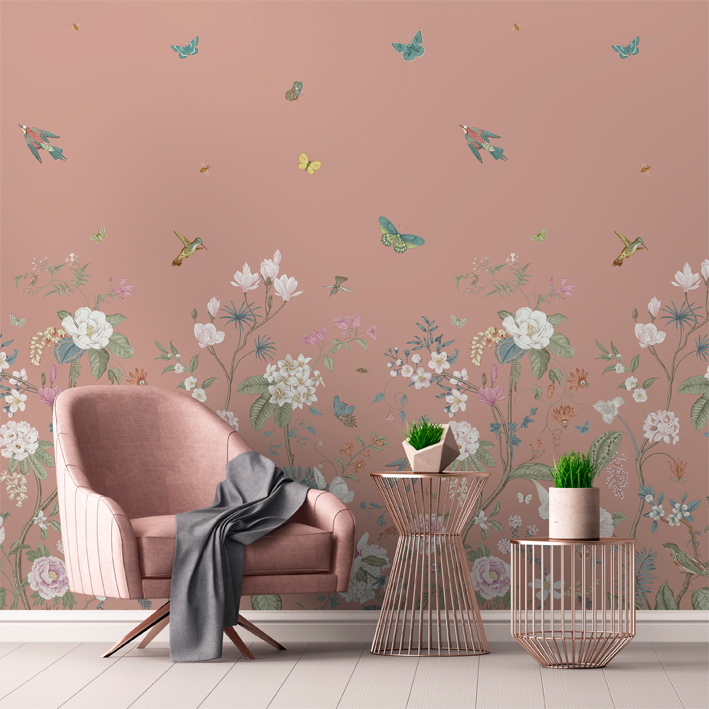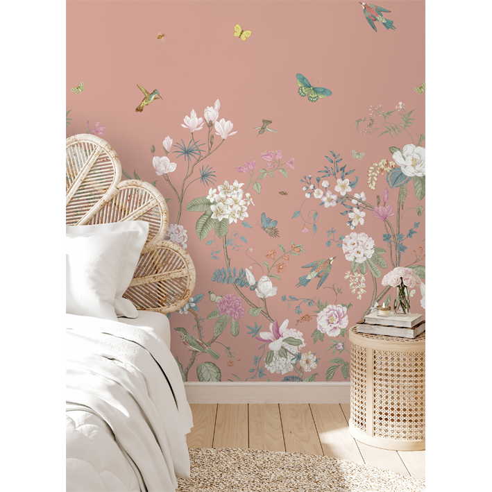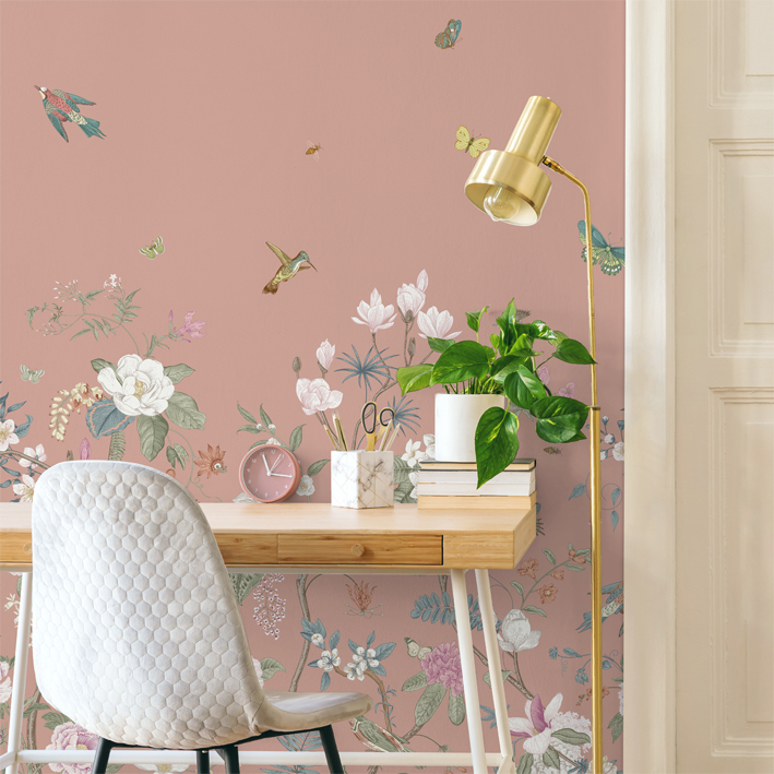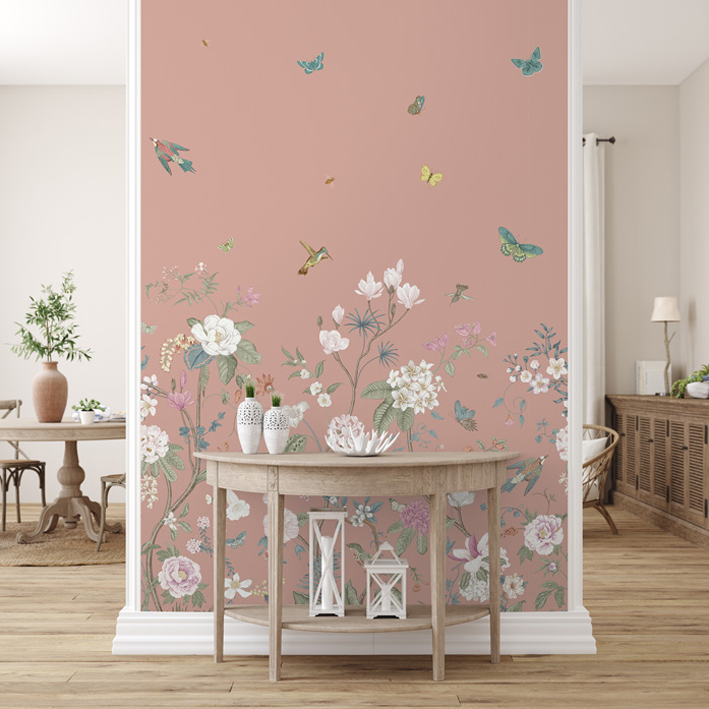Shades from the entire spectrum of the rainbow come together in this pink butterfly floral wallpaper. It has a fanciful and playful feel with small creatures flying through the air and lighting atop flowers across the surface of the wallpaper. As a modern wallpaper, it has beautiful artistry and could be the ideal choice for adding colour and animal companions to a nursery or playroom for kids.