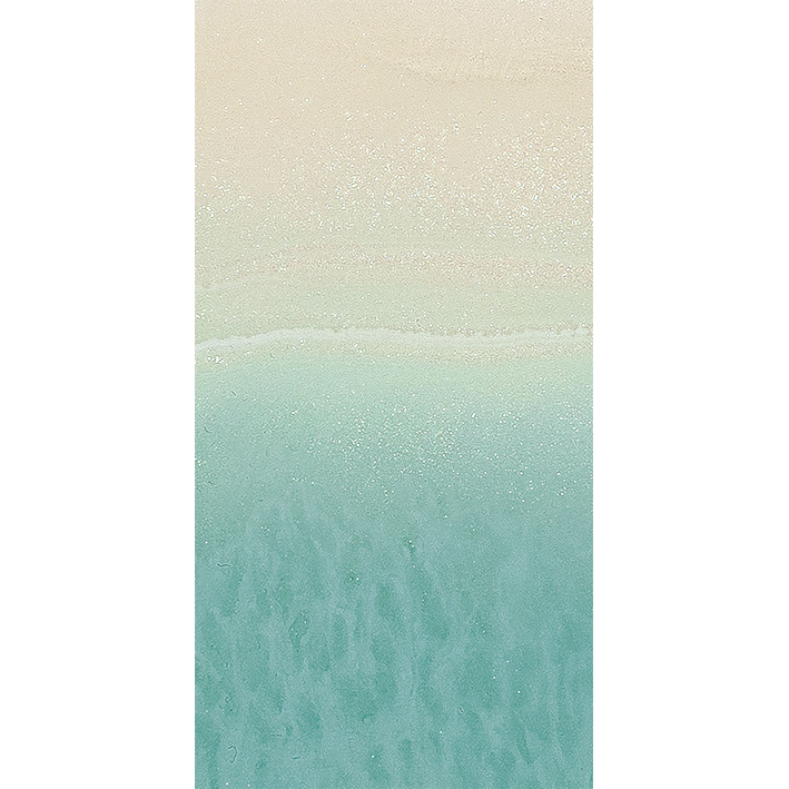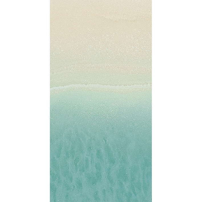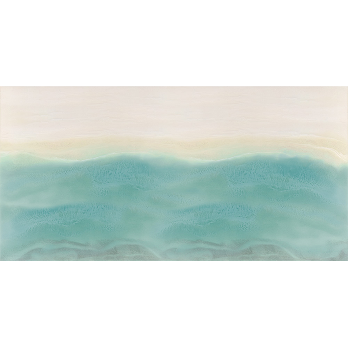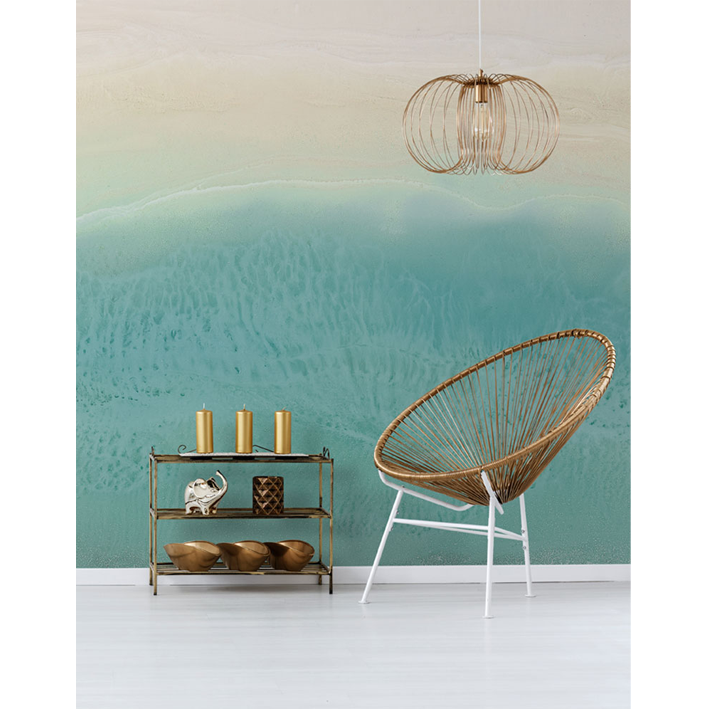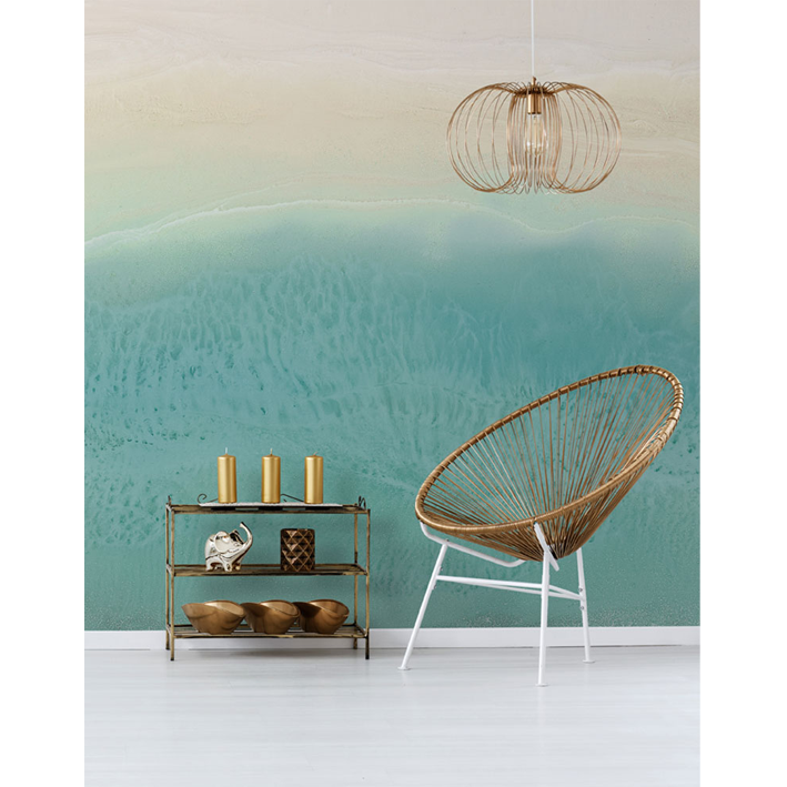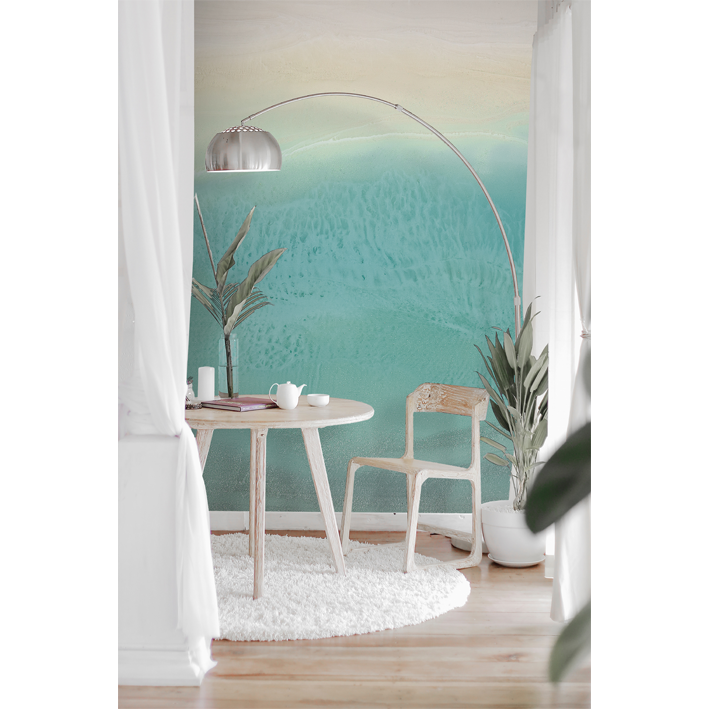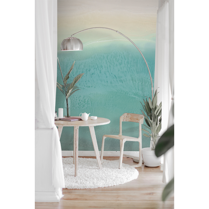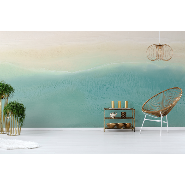 This ocean-inspired seascape wallpaper mural is layered with soft hues of aqua and white pigments. A cool-toned color palette was used to create this serene, modern, multi-dimensional painting. In the original artwork, hints of sparkle can be found in the soft washes of white foamy waves near the shore.