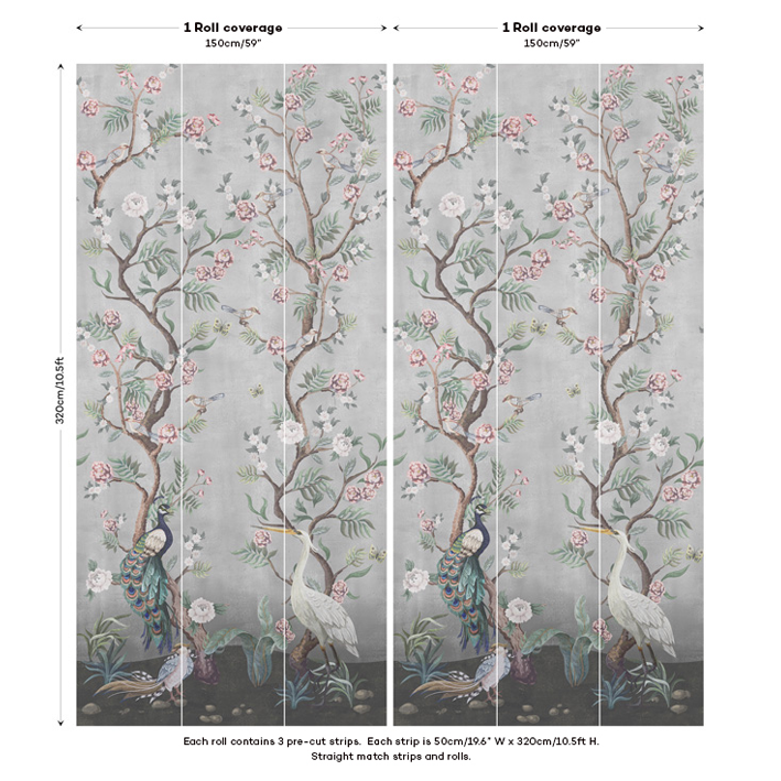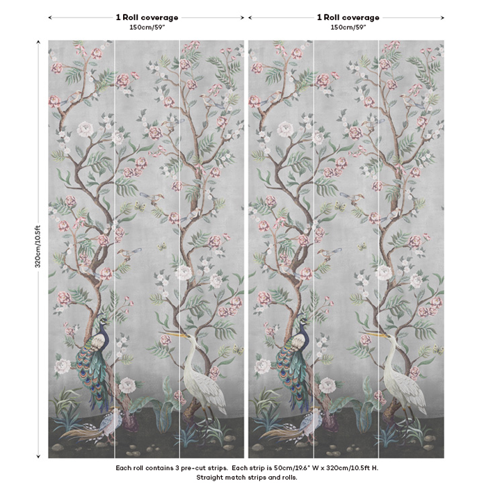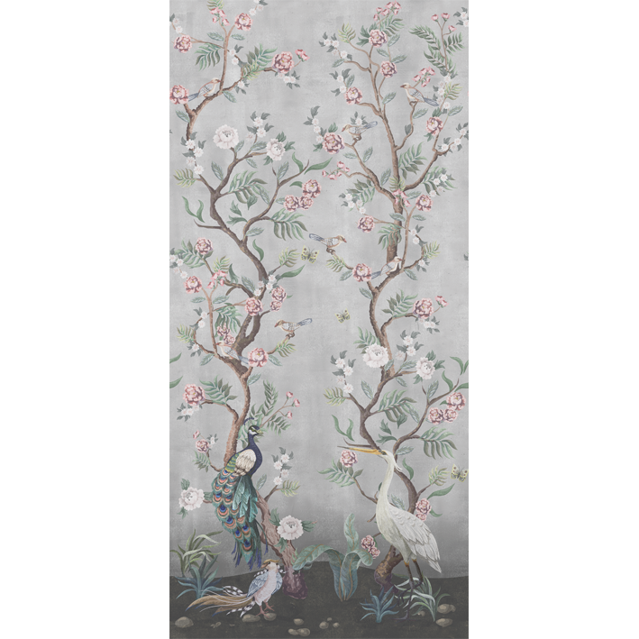 The beautiful grey Chinoiserie wallpaper has a misty background with cherry blossoms and exotic birds at the forefront to create a relaxing atmosphere. Kubla Khan is a designer wallpaper created by our talented in-house team that blends a cherry blossom design with the subtlety of a distressed background.