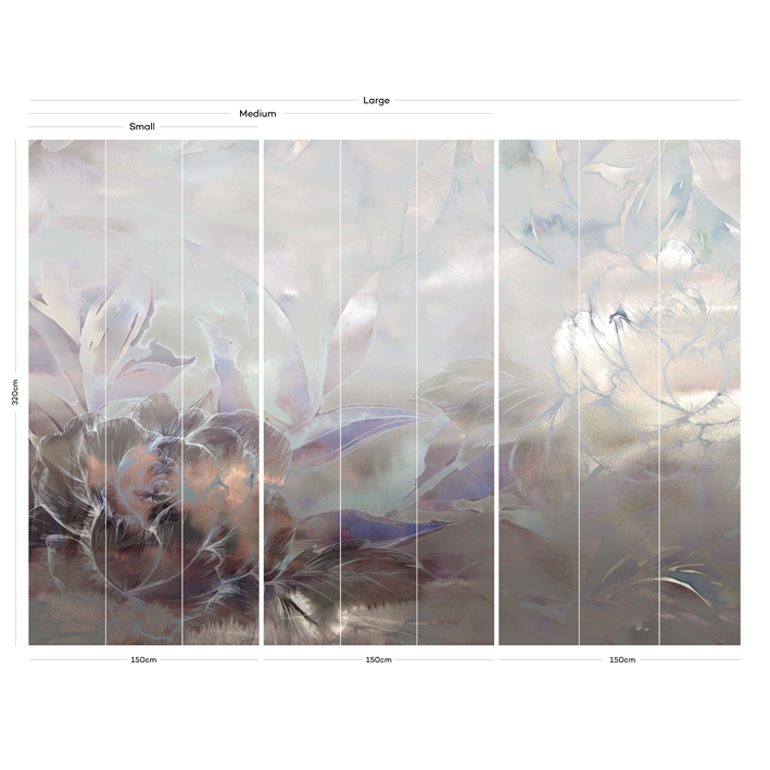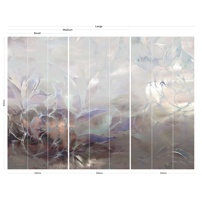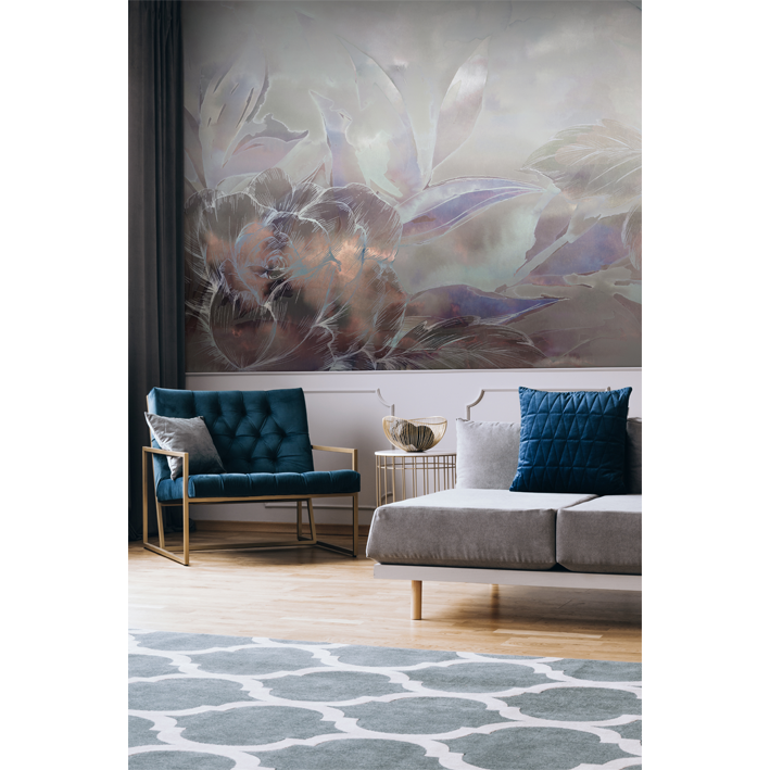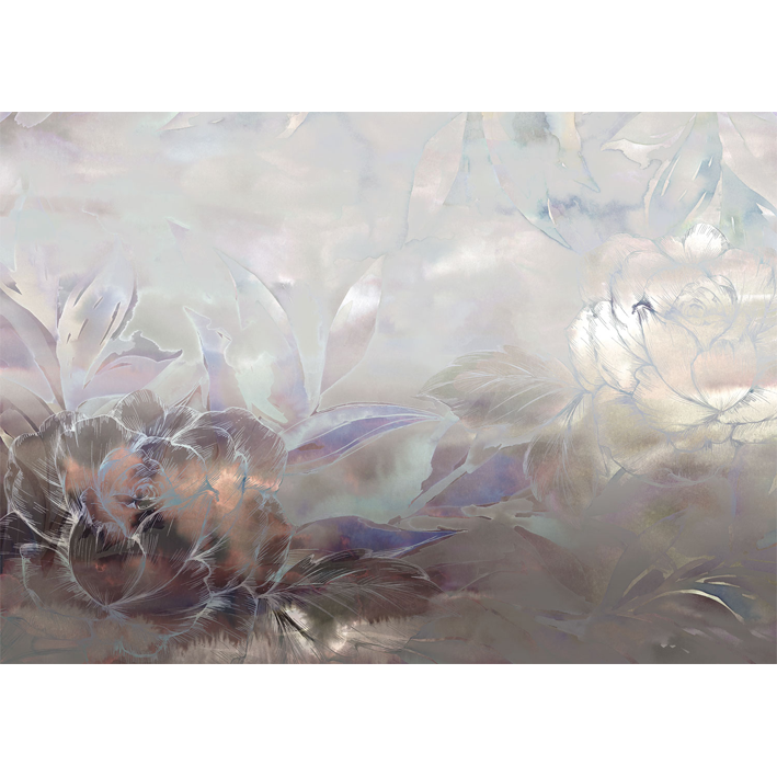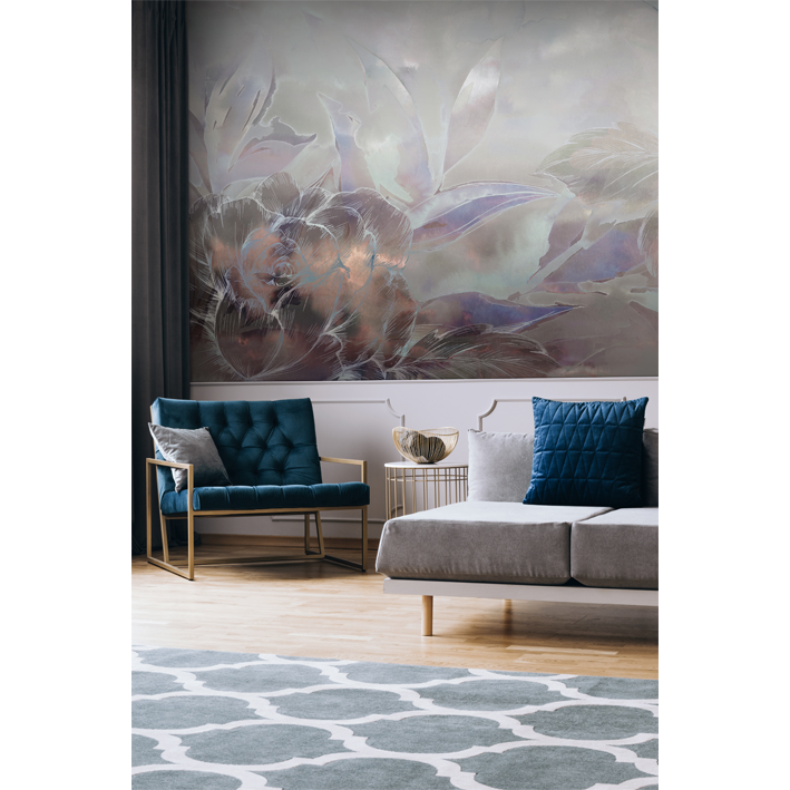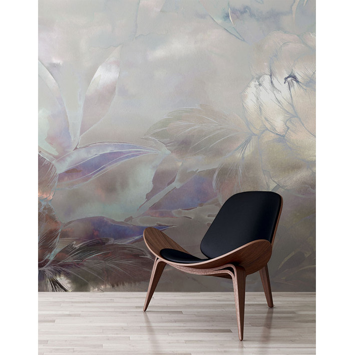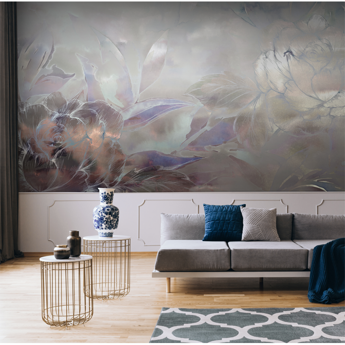In this dramatic silver floral wallpaper mural, blooms are set against an abstract background that moves from hints of bronze through to soft greys and mute greens. This luxurious, high-end wallpaper brings a real sense of class to your space.