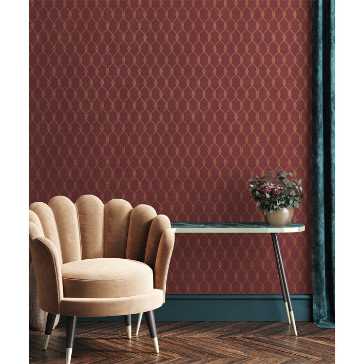 The Mansfield wall mural takes inspiration from the Victorian age with an intricate design of lacing and cordage to create a geometric wallpaper of harmony. This red & bronze vintage trellis wallpaper mural has a bright red background covered by the meshwork to offer a restrained style.