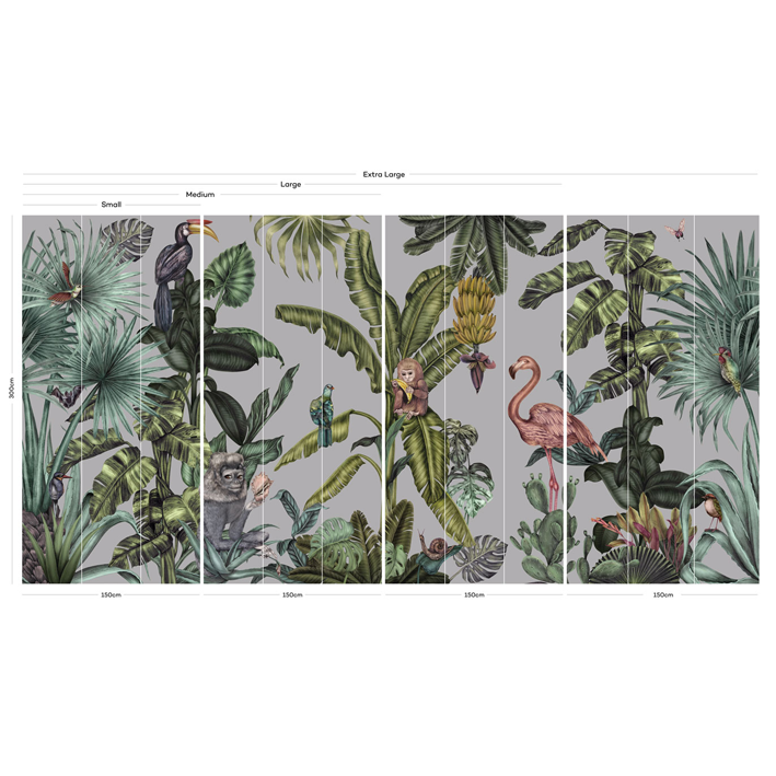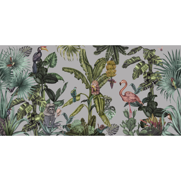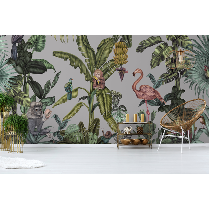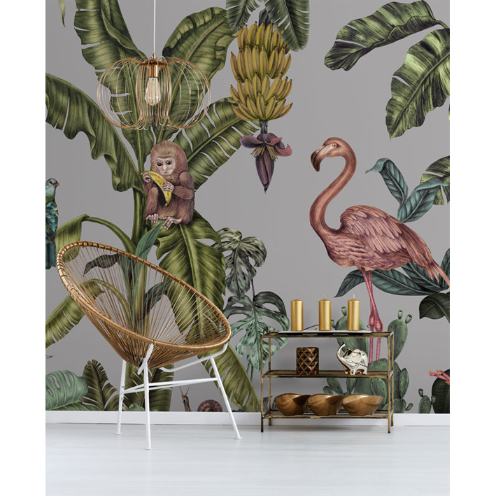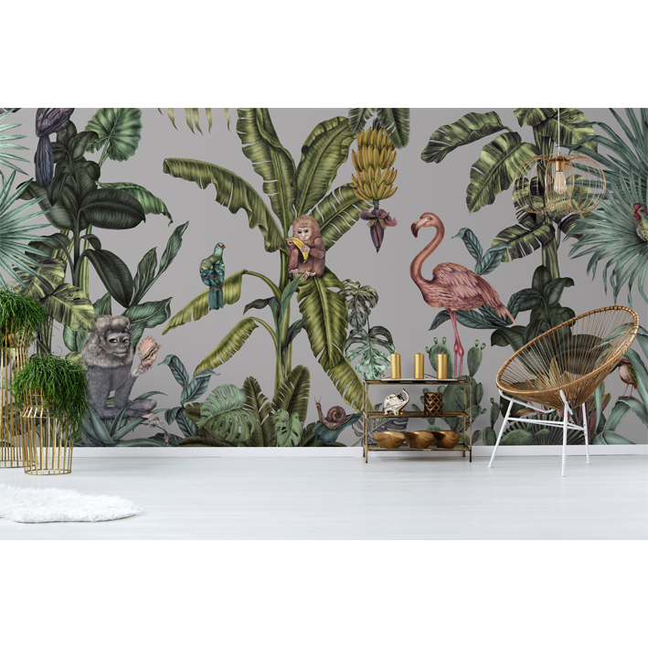 Explore this luscious tropical wallpaper mural, created by artist Karina Eibatova. Amongst the palm fronds and exotics flowers you’ll find delightfully detailed illustrations of hornbill birds, monkeys, flamingos and all manner of exotic flora and fauna.