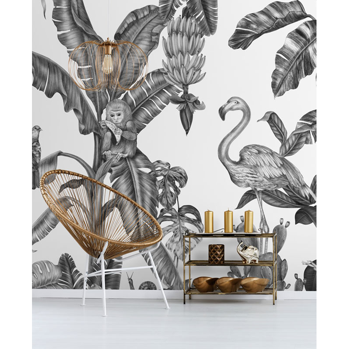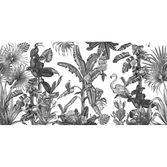 This grey & white exotic bird monkey jungle mural was designed by artist Karina Eibatova and features a stunning assortment of exotic illustrations. The Monkeys with Birds wallpaper mural features animals like elephants and hornbill birds in a black and white environment of palm fronds and unique flowers.