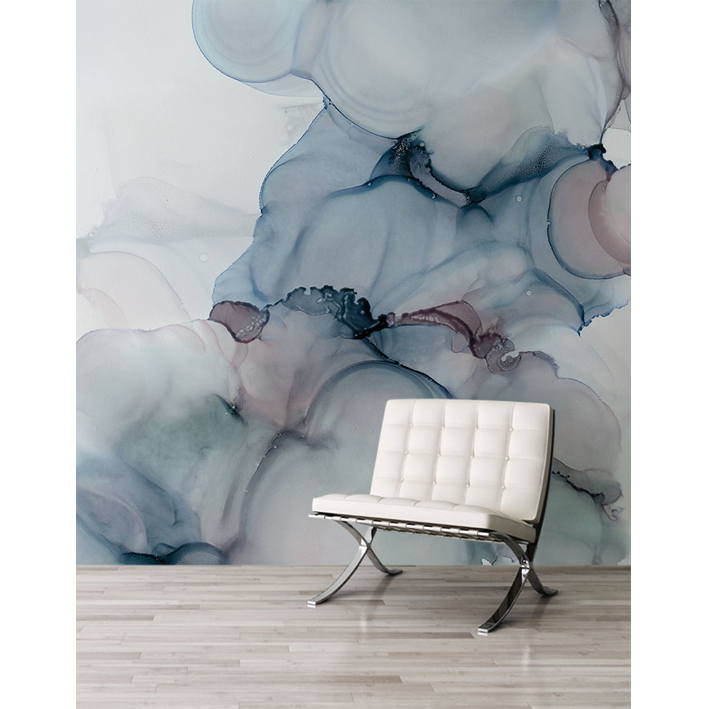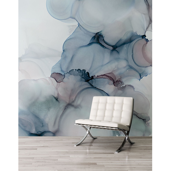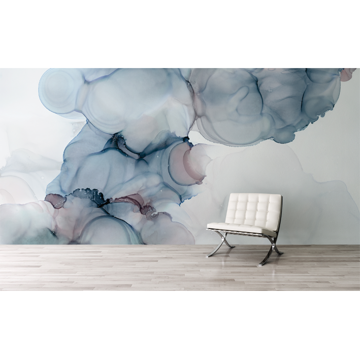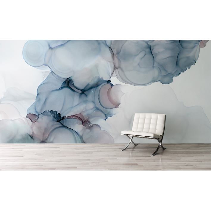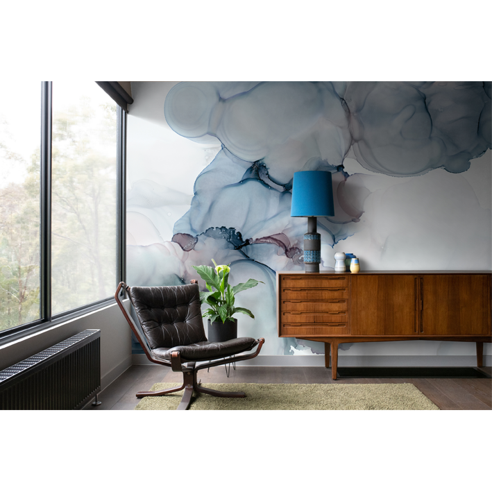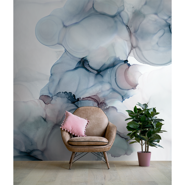 A dreamy and mystical blue, grey and taupe wall mural by LA artist Stacy Solodkin. A wonderful centrepiece design that can be used to frame a piece of furniture or feature within a room.