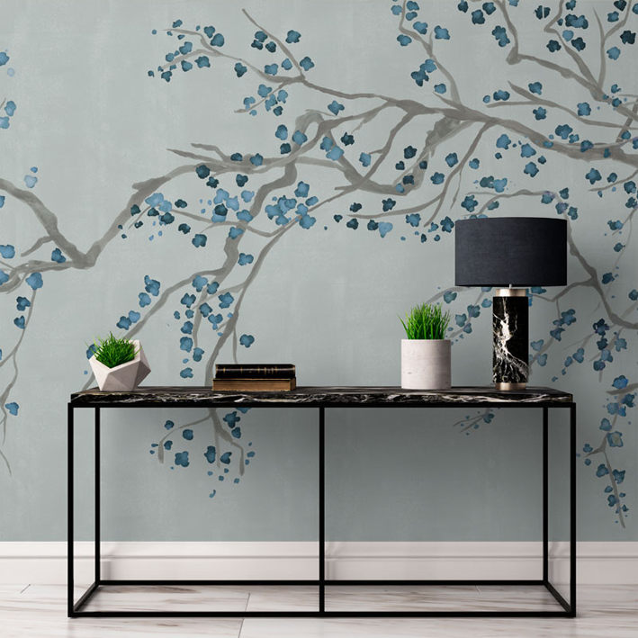 The depth of colour in this blue cherry blossom wallpaper mural from our Takeda design adds luxury and romance to any room. A duck egg background with a distressed detailing perfectly offsets the blue flowers of the blossoms, creating a stunning chinoiserie-style blue cherry blossom wall mural. Style this designer wallpaper with natural interior decor and modern furniture. Your bathroom, living room or kitchen will be transformed into a room filled with elegance and style.