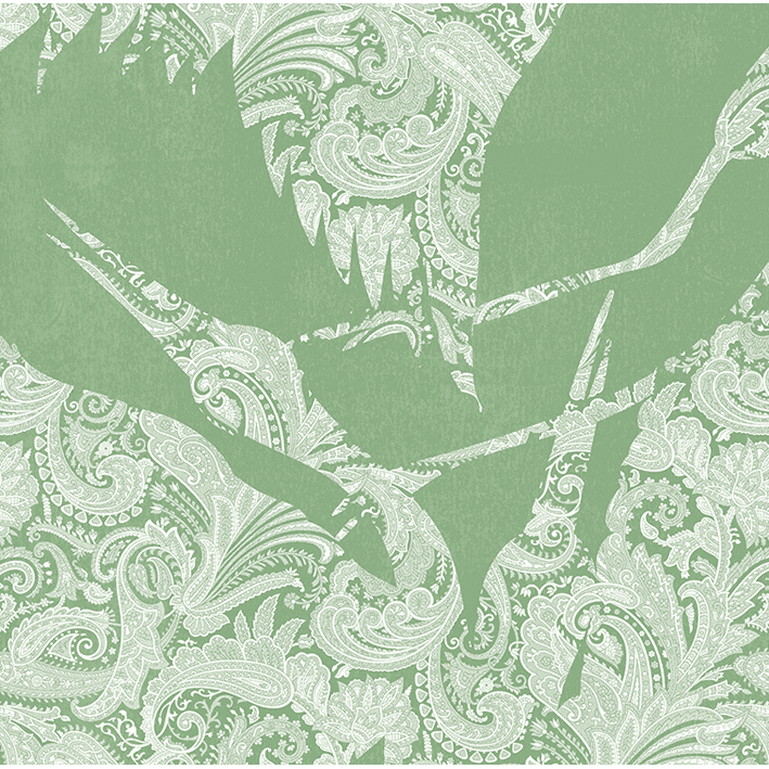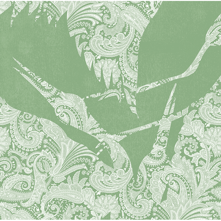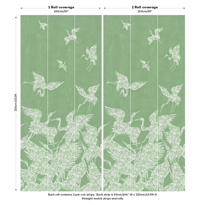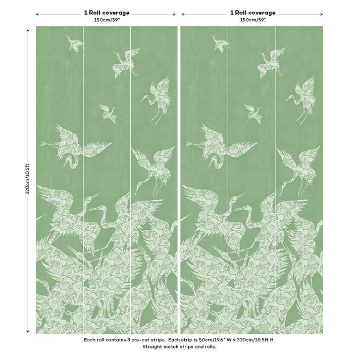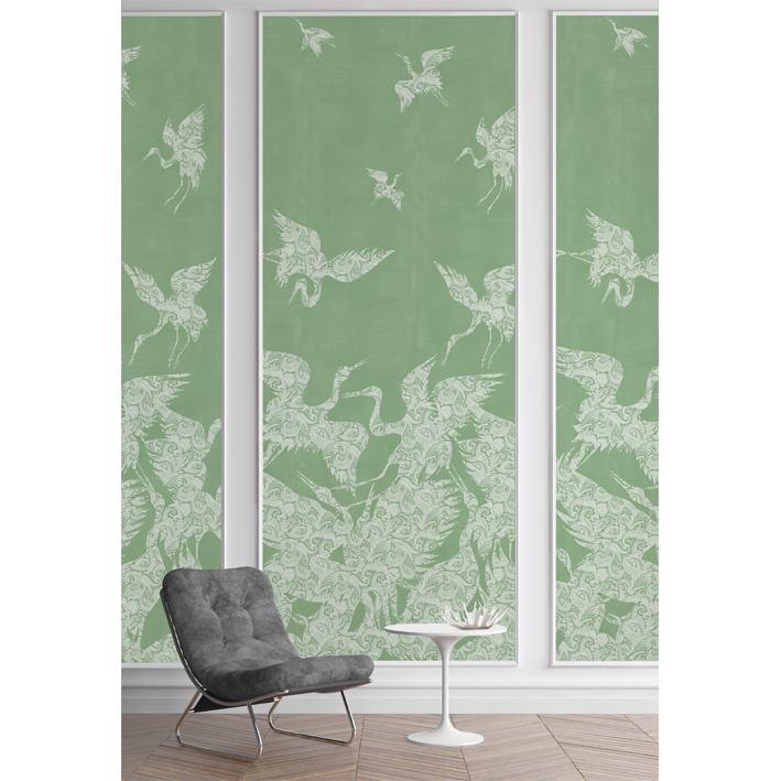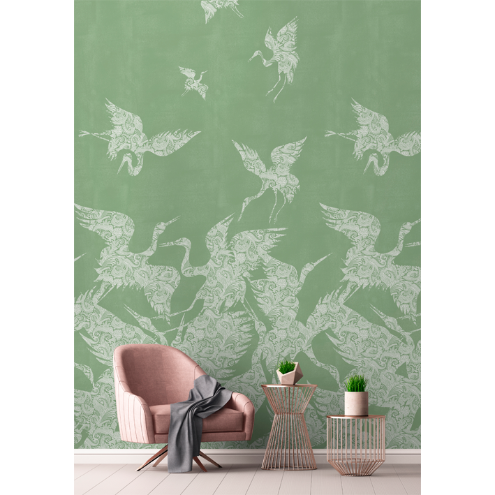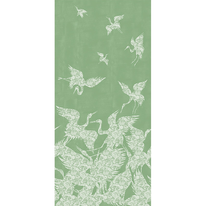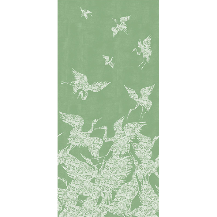This beautiful green & white crane wallpaper captures the energy and a beauty of a flock (known as a ‘swoop’) of cranes as they take flight. Each crane is picked out in a detailed and intricate paisley pattern, whilst a lightly distressed background enhances the design. This stunning wallpaper will particularly suit design projects that are looking to introduce a chinoiserie wallpaper feel.