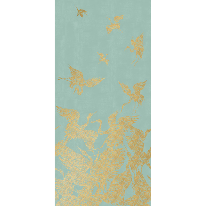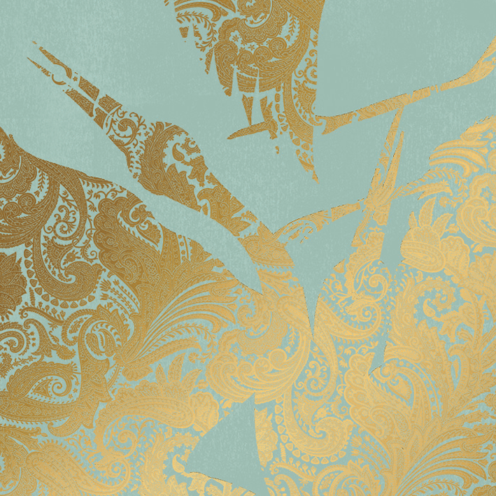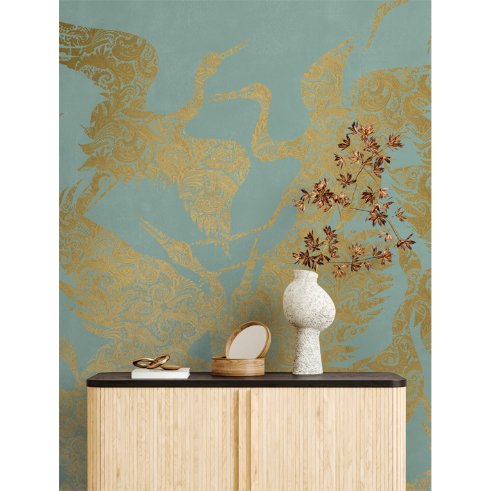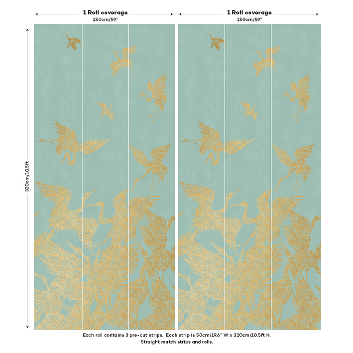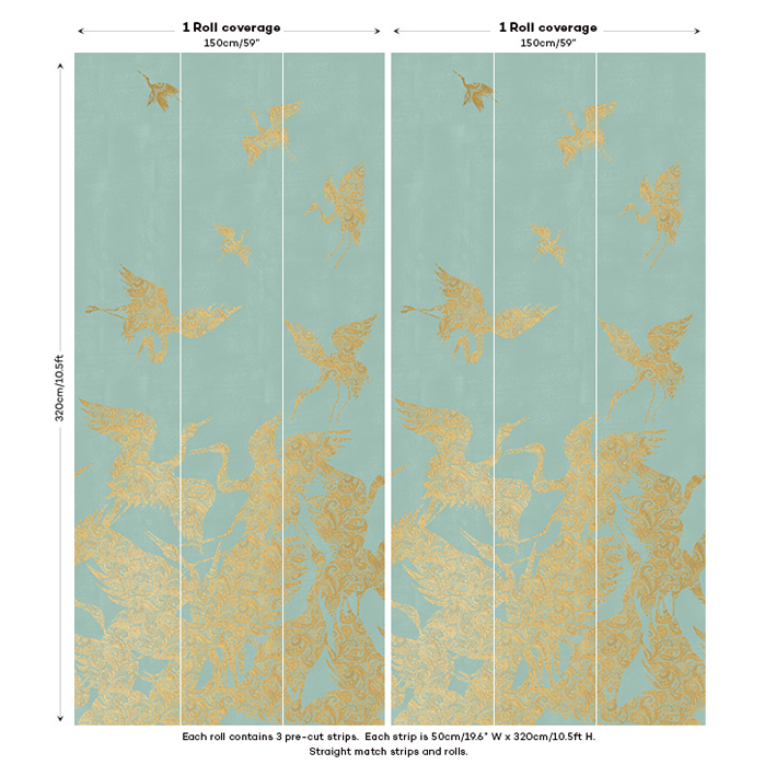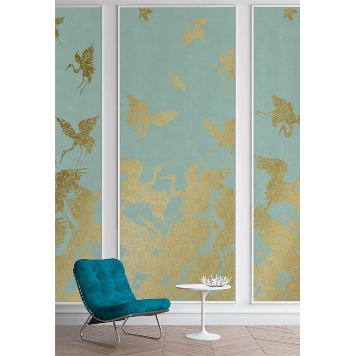 This luxury green and gold heron wallpaper captures the energy and a beauty of a flock (known as a ‘swoop’) of herons as they take flight. Each heron is picked out in a detailed and intricate gold metallic paisley pattern, whilst a lightly distressed background enhances the design. This stunning metallic wallpaper will particularly suit design projects that are looking to introduce a chinoiserie wallpaper feel.