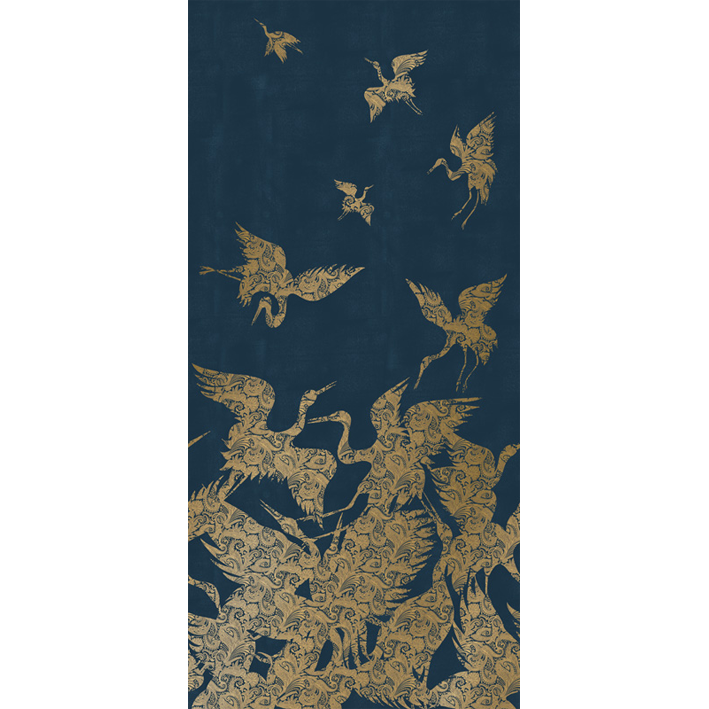 This luxurious blue & gold heron wallpaper captures the energy and a beauty of a flock (known as a ‘swoop’) of herons as they take flight. Each heron is picked out in a detailed and intricate gold metallic paisley pattern, whilst a lightly distressed background enhances the design. This stunning metallic wallpaper will particularly suit design projects that are looking to introduce a chinoiserie wallpaper feel.