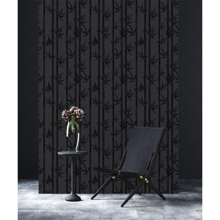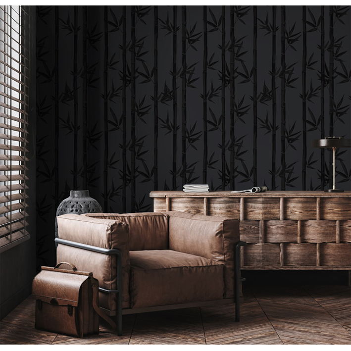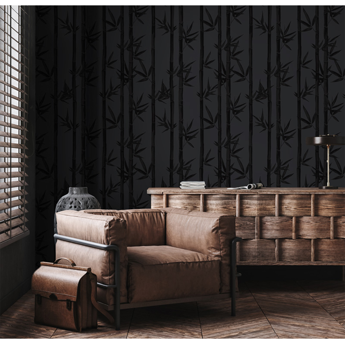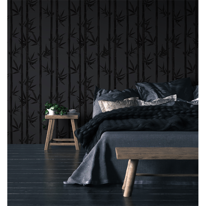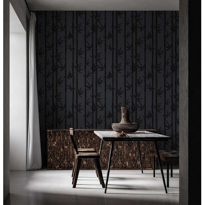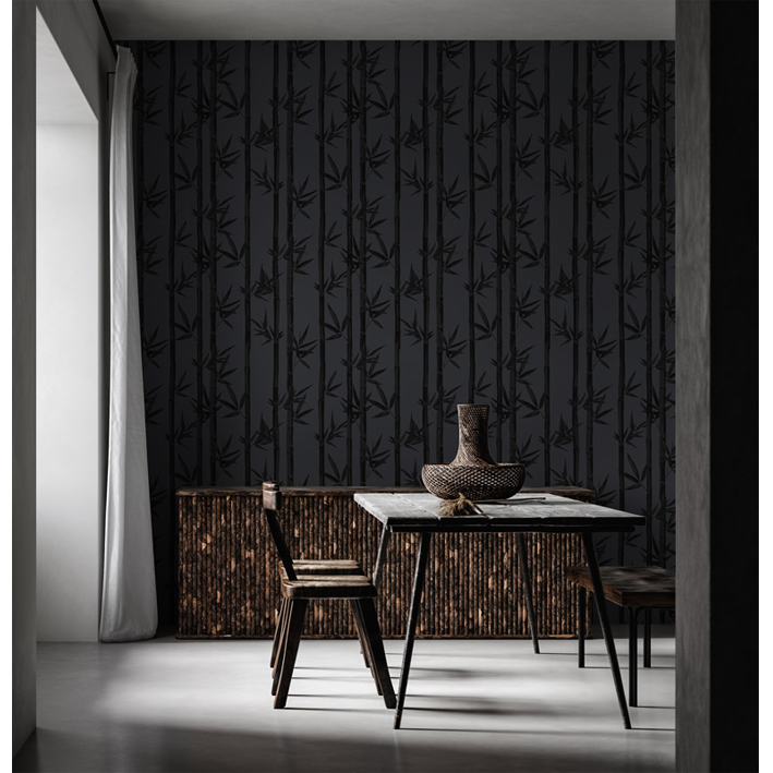 Enjoy a twist on traditional wallpaper with this stunning black tropical bamboo wallpaper. It uses a variety of dark hues to create an image of a night-time scene with bamboo sprouting up into the heavens. This is an excellent contemporary wallpaper for use in a modern home. It can add a bit of mystery and intensity to spaces like bedrooms, dens, and living rooms.