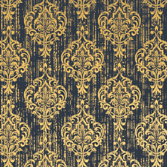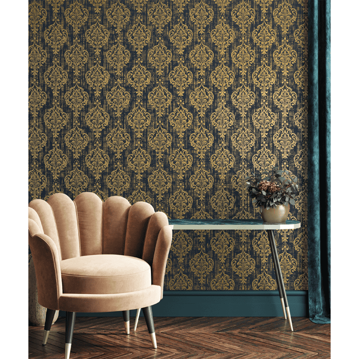 This blue & gold distressed damask wall mural incorporates design from the Victorian age to add elegance to a room. The Wentworth wall mural is defined by brocade patterns across a single colour background and has a metallic luster to create an embossed look.