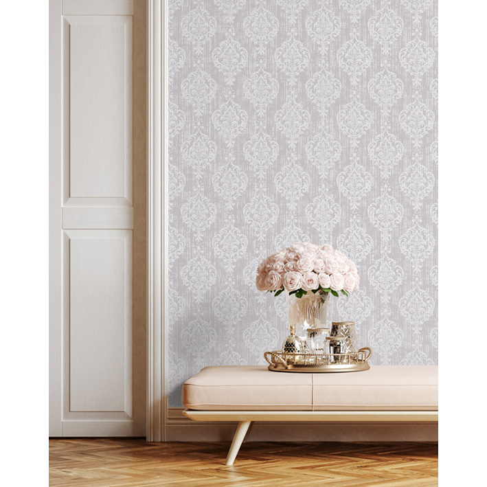 Featuring a brocade style from the Victorian age, the Wentworth pastel & silver distressed damask wall mural has luxury and elegance for a dining room or parlour. This wall mural has a rich decorative pattern covered in a metallic shine to create the traditional look of brocade wallpaper.