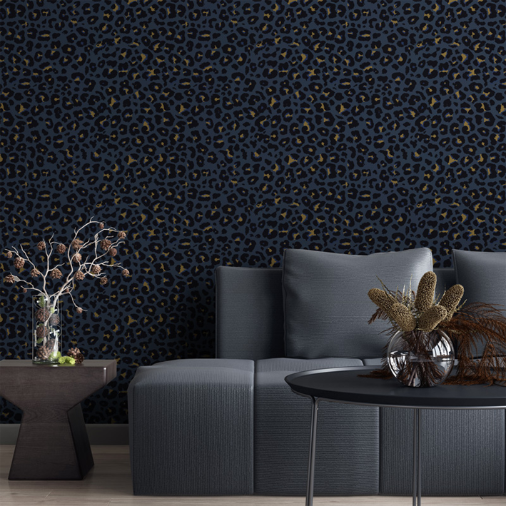 Try this stunning blue leopard print wallpaper in any space that could make use of a touch of darkness and mystery. The contemporary wallpaper design features a dark blue background with black leopard spots that ring small areas of yellow and orange. It’s an exceptional choice for anyone who loves large exotic cats, especially leopard or cheetah print wallpaper, and is suitable for offices, living rooms, and bedrooms.