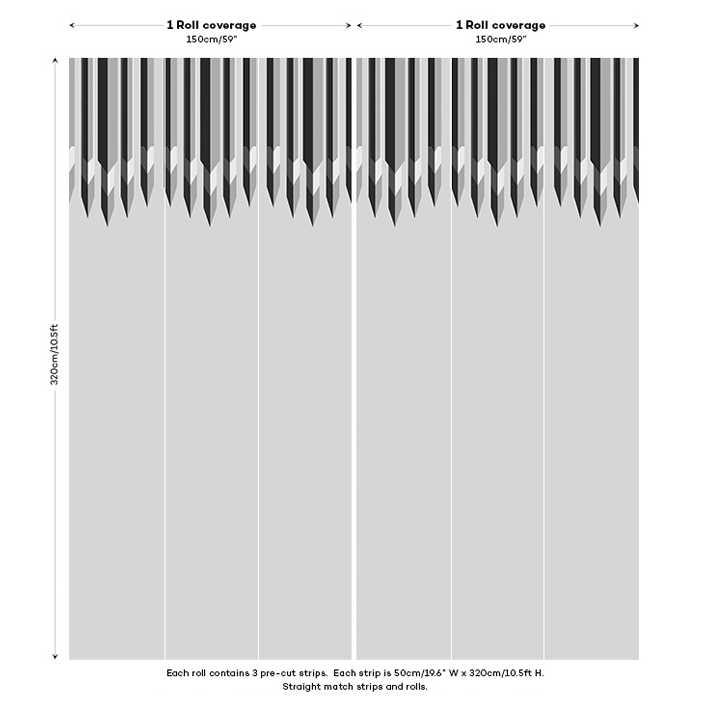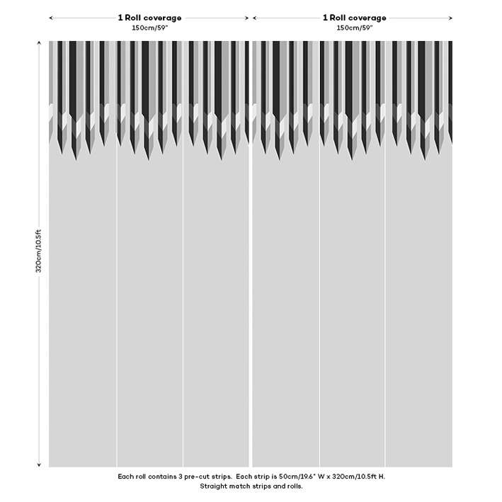 Created by artist Tim Muddiman, Angular Walk is a wallpaper with a unique contemporary aesthetic. The angular striations that descend from the design draw our eyes upwards creating a striking focal point within a room. The graphic geometric shafts descend towards a soft grey background, allowing any furniture to sit comfortably within the design. Choose this grey geometric stripe wallpaper for a modern bathroom interior.