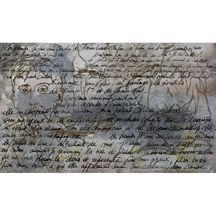 First lines, in black ink on a grey wall, of the greatest of novels. Just sketched portrait of the greatest writer. The candle, the reading, the sleeping child, everything is in this panoramic wallpaper, nothing has been forgotten.