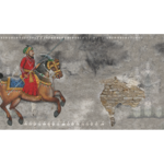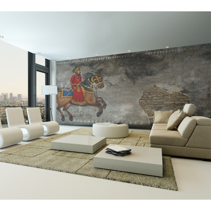 Trip to India. The colourful and meticulous drawing of a proud horseman, facing his reflection carved into the decrepit wall. Vestige of another era. A panoramic wallpaper with a change of scenery.