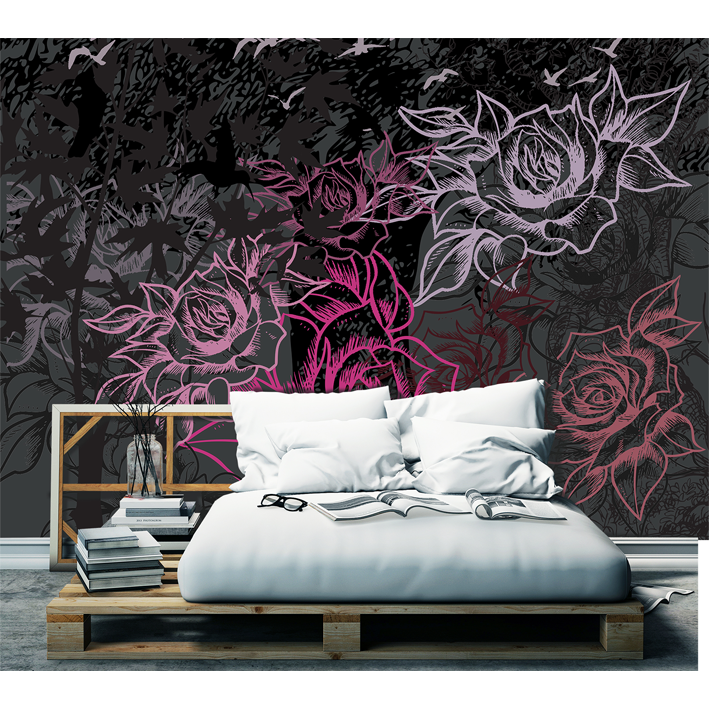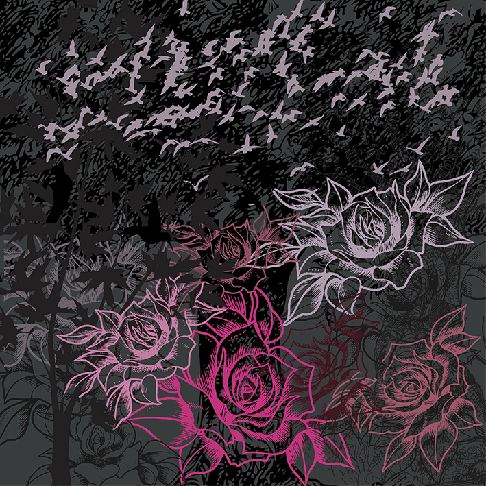 ARBRE ET OISEAUX ROSE SUR GRIS