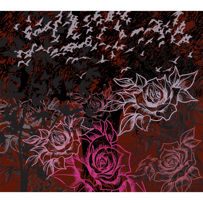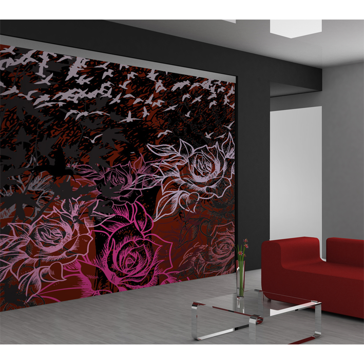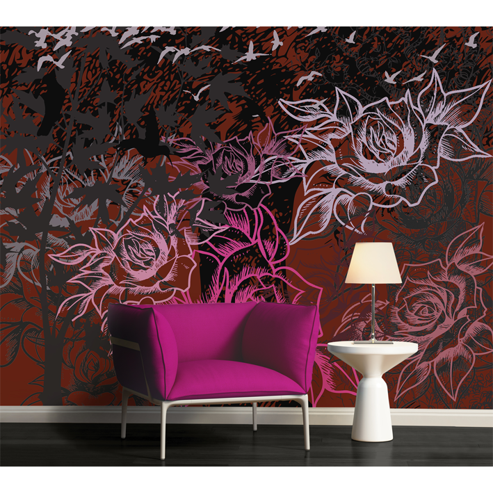ARBRE ET OISEAUX ROSE SUR ROUGE