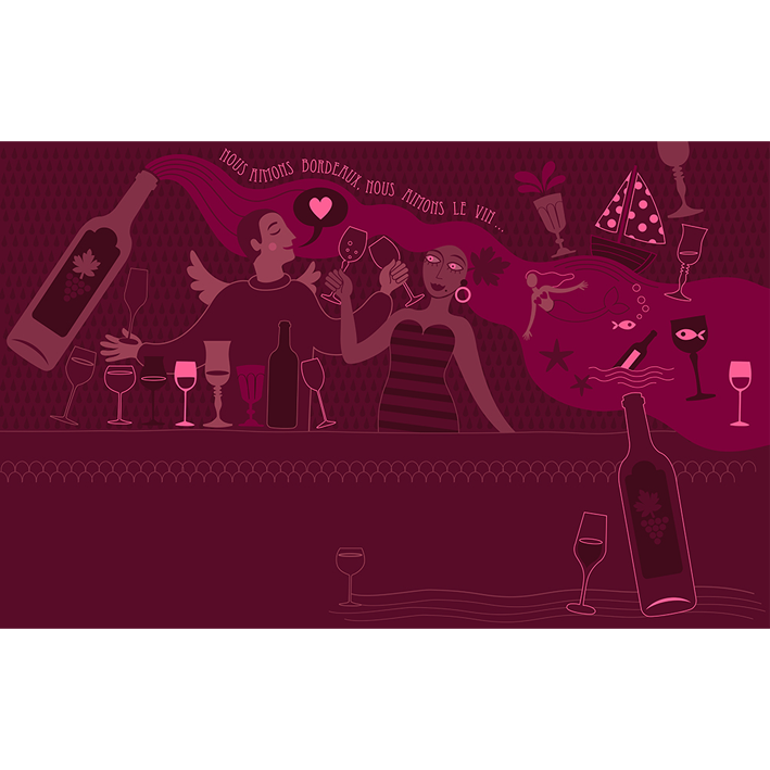 Festive silhouettes in multiple variations of purple and burgundy. A graphic and contemporary panoramic wallpaper. It's the touch of fluorescent pink that makes the difference, and the little heart that goes boom boom!