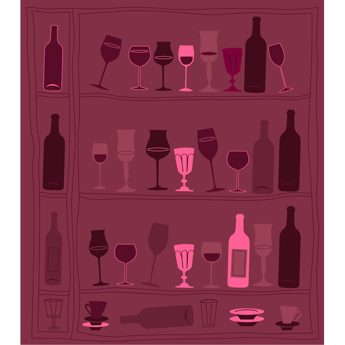 Silhouettes of wine glasses in multiple variations of purple and burgundy. A graphic and contemporary panoramic wallpaper. It's the little touch of fluorescent pink that makes the difference!