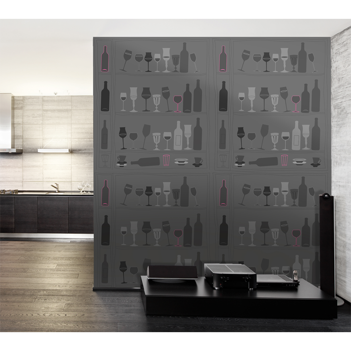 Silhouettes of wine glasses in multiple variations of grey. A graphic and contemporary panoramic wallpaper. It's the little touch of fluorescent pink that makes the difference!