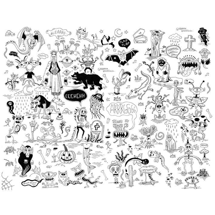 Grrrr! Those nasty monsters are doing everything they can to horrify us! Black on white background, this is a rather funny panoramic wallpaper! Not even afraid!