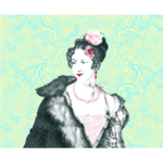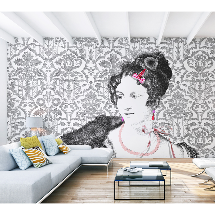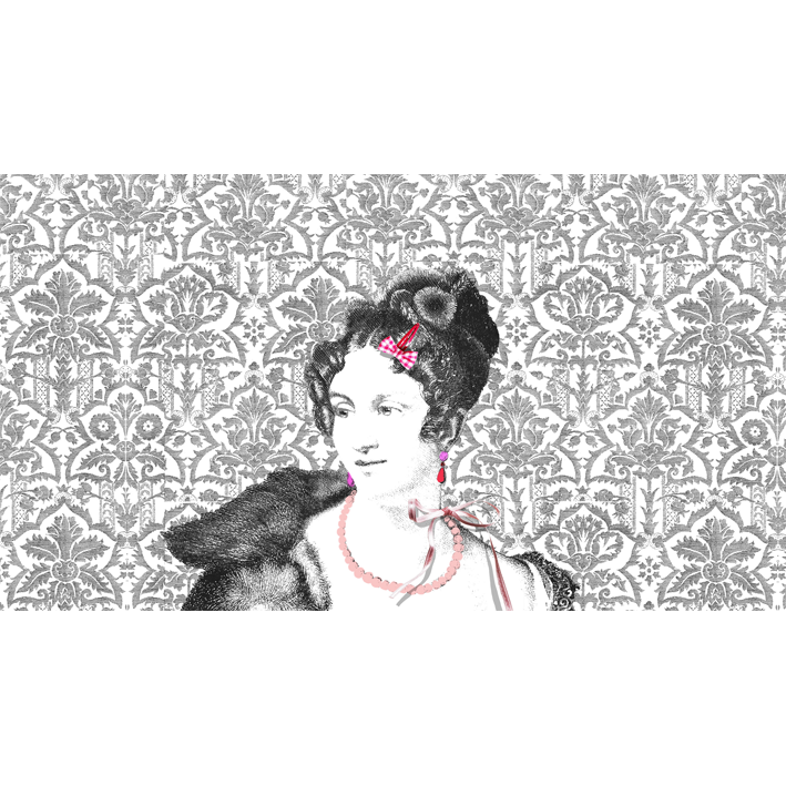 A sober but sophisticated panoramic wallpaper in homage to Mademoiselle. A masterful portrait on a Classic black and white background. Ah, the delicacy of the little pink ribbon around her neck!