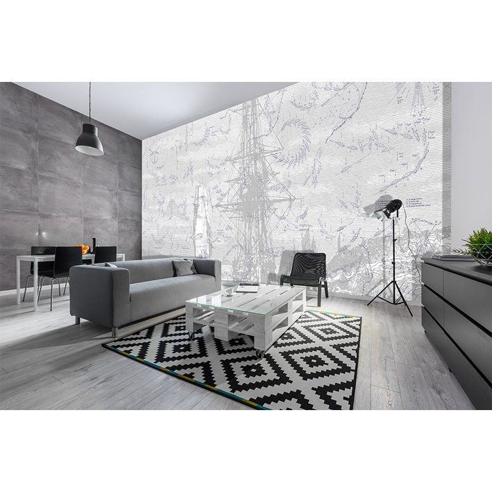 Wallpaper depicting a series of maneuvers by three-masted sailing ships against a background of old engravings from the era of great sailing: Description of the Wallpaper: Maneuvers on a Three-Masted Sailboat: On the main part of the wallpaper, detailed illustrations show various maneuvers on three-masted sailboats. Antique Engraving Background: In the background, an antique engraving motif depicts several sailboats at sea, with their sails inflated by the wind and stylized waves. This background is slightly faded to highlight the maneuvers, while adding a historical and artistic touch. Ambience and Use: This wallpaper is perfect for a room dedicated to a passion for the sea, such as an office, living room or library, providing both a historical touch and an invitation to maritime adventure.