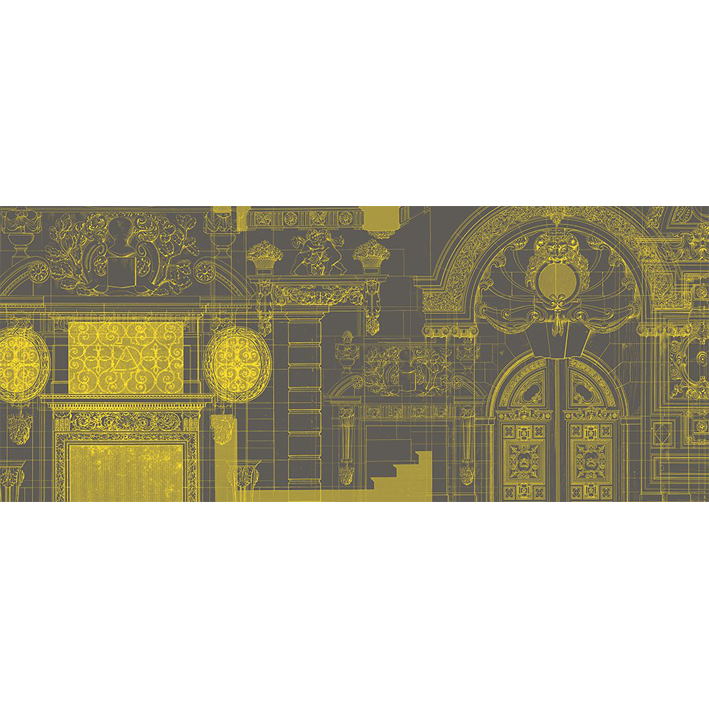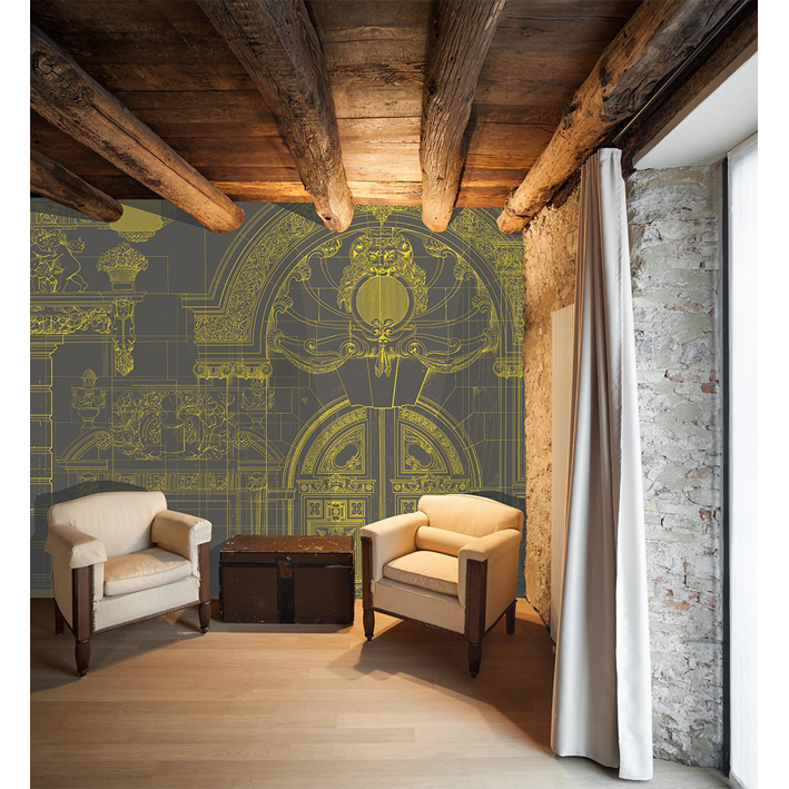 this wallpaper with architectural drawings of doors to buildings, castles or other architectural structures can add a touch of elegance and character to an interior. It blends the art of technical drawing with the historic beauty of architecture, bringing a unique atmosphere to any space.