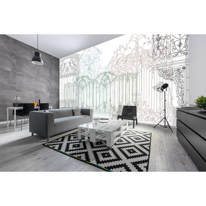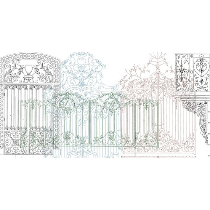 This wallpaper depicting drawings of ironwork such as stair railings, gates, balconies and railings is an ideal decorative choice to bring a touch of elegance and refinement to any room. Ironwork, particularly from the 18th to the 19th century, is renowned for its ornamental beauty and delicacy. The designs of these architectural elements can capture the precision of metalwork, while injecting an artistic style and architectural dimension into the space.