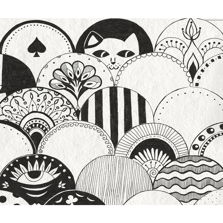 Mandala-inspired, fish scales, japanese graphic design... We have fun looking for the cat or the bird, hidden in volutes drawn on white paper, in this panoramic wallpaper, so restful.